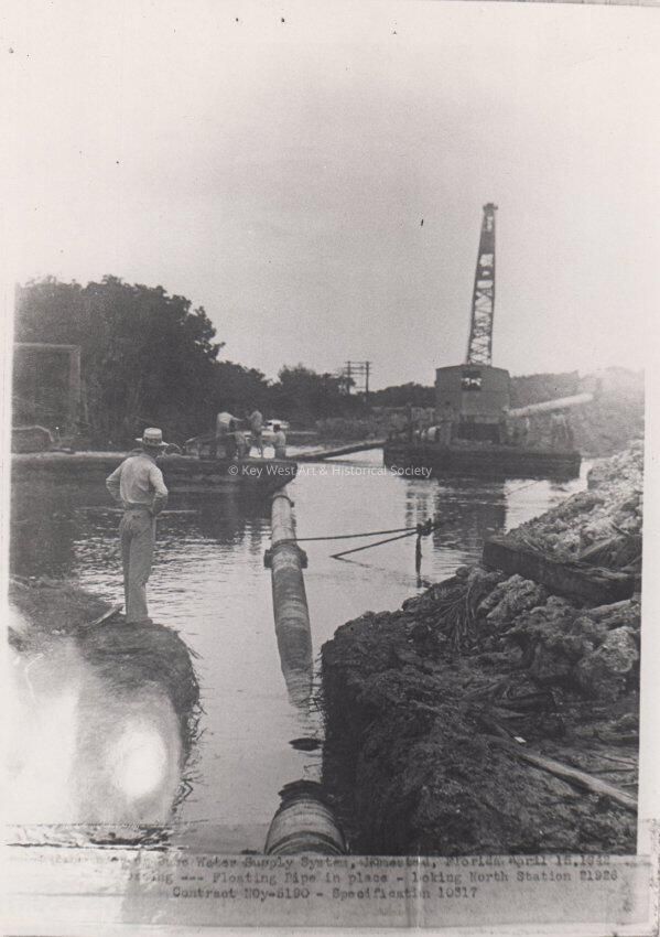 Key West Naval Operating Base Water Supply System, Homestead, Florida. April 28, 1942. Floating pipe in place - looking north Station 21926. Contract Noy-5190 - specification 10317.