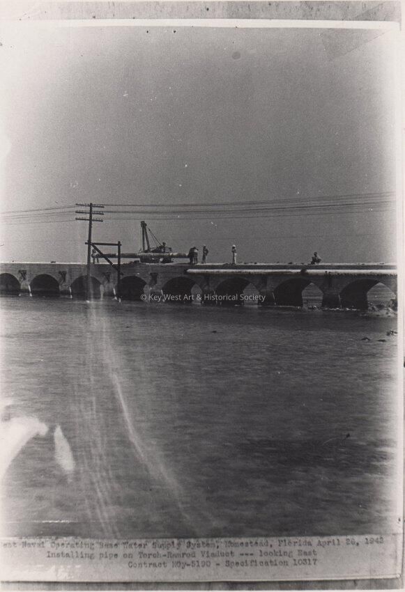 Key West Naval Operating Base Water Supply System, Homestead, Florida. April 28, 1942. Installing pipe on Torch-Ramrod Viaduct - looking east. Contract Noy-5190 - specification 10317.Copyright