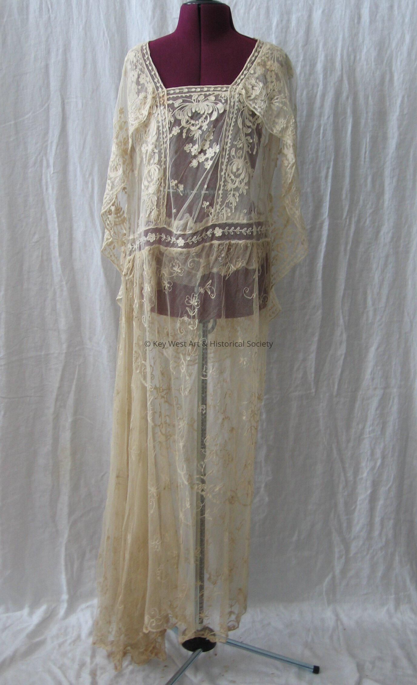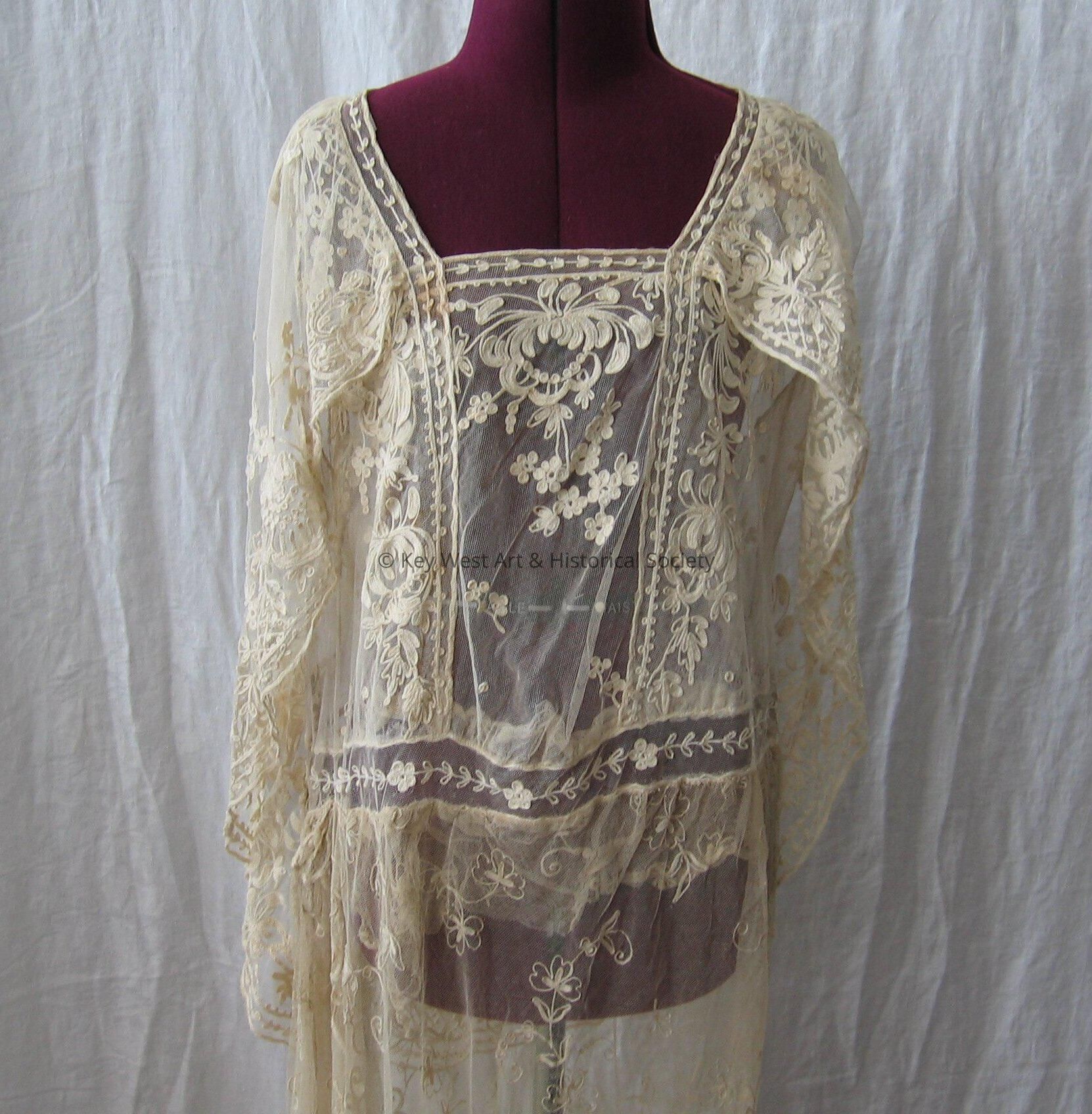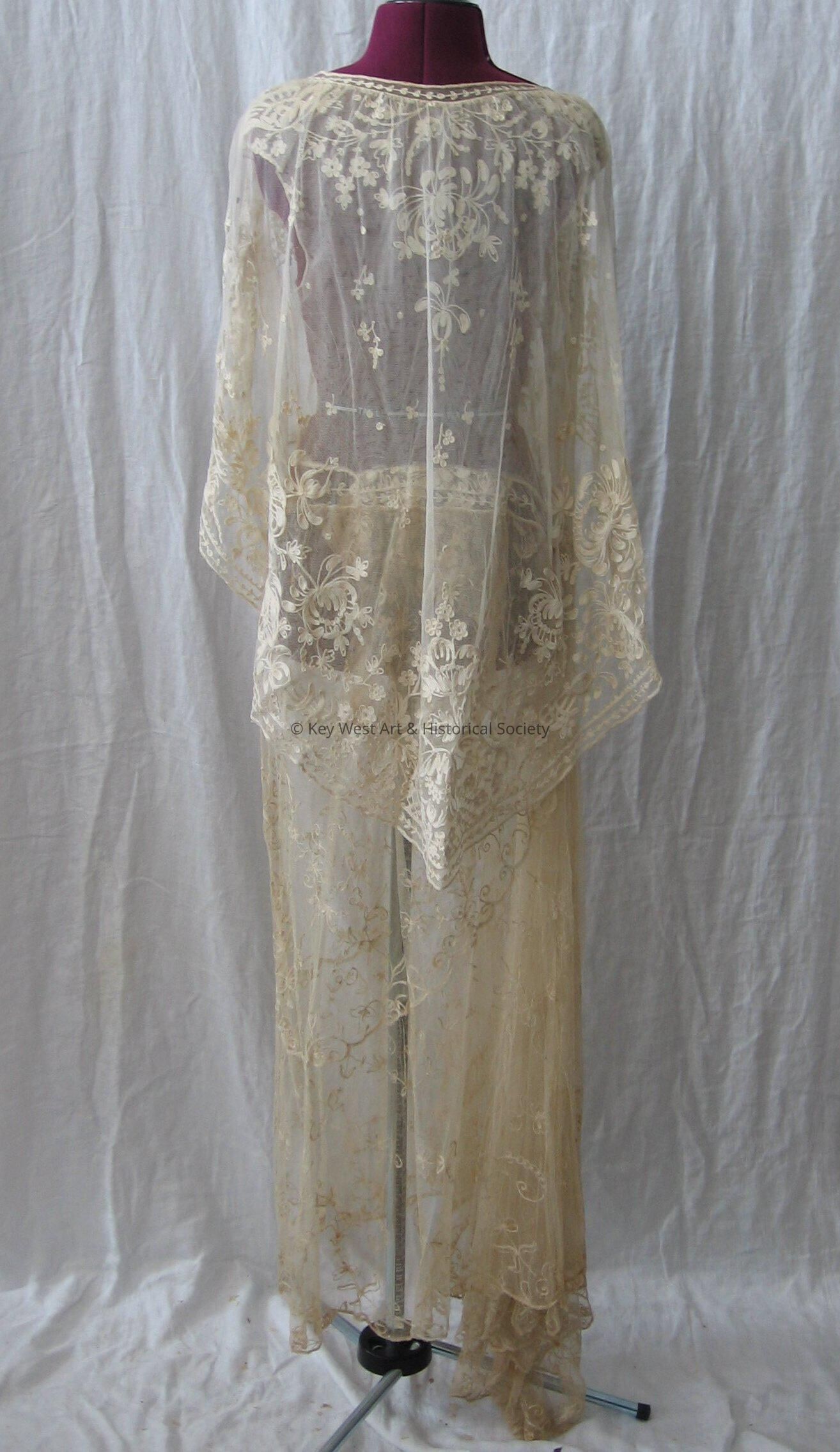 Sheer dress with white lace detailing and a gathered shoulder train. Likely a top layer for a wedding dress.