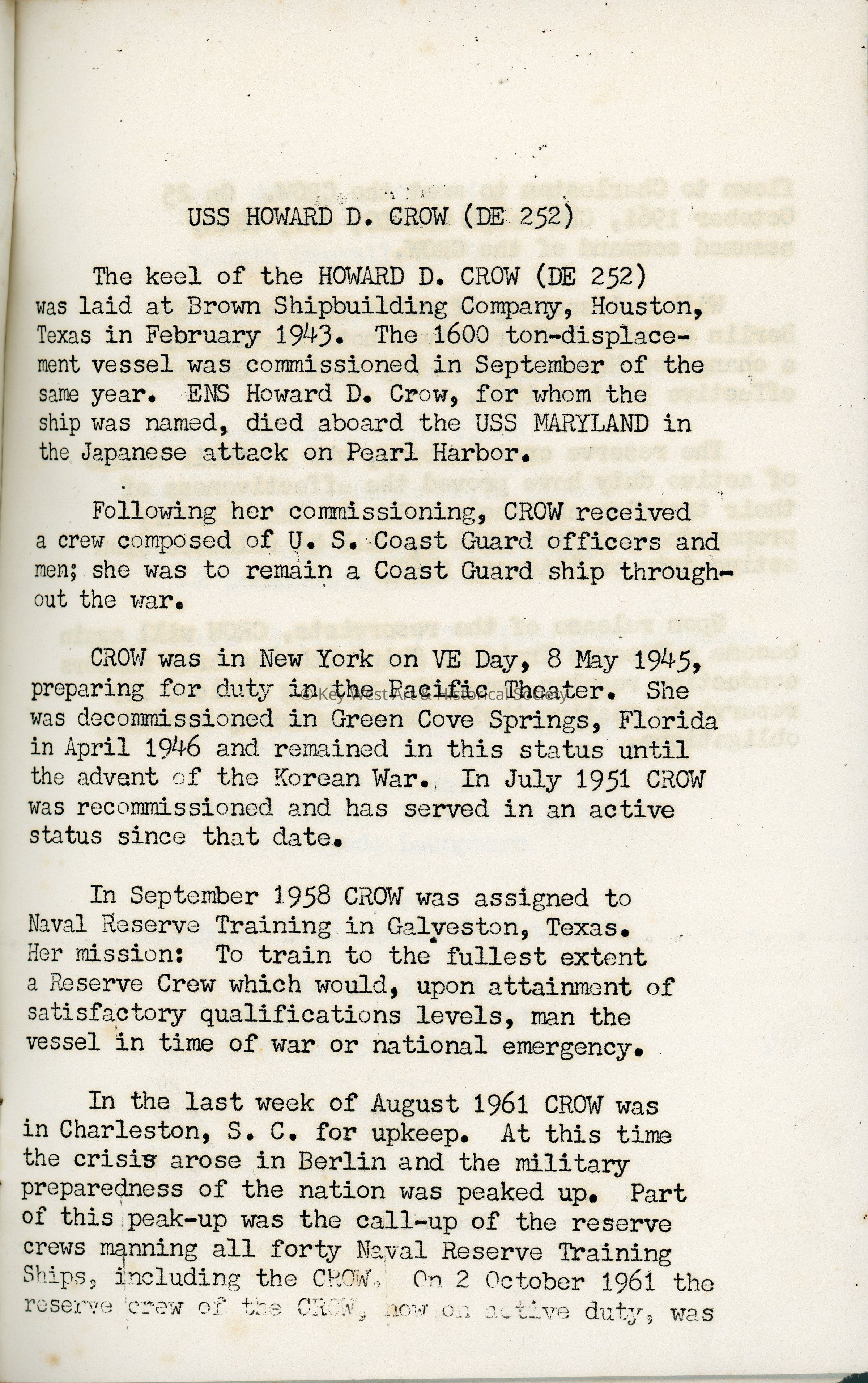 Pamphlet describing the USS HOWARD D. CROW (DE-252), an Edsall class destroyer commissioned on September 27, 1943. The CROW was one of the ships open for visitors on Armed Forces Day 1962 at Naval Station Key West.Collection