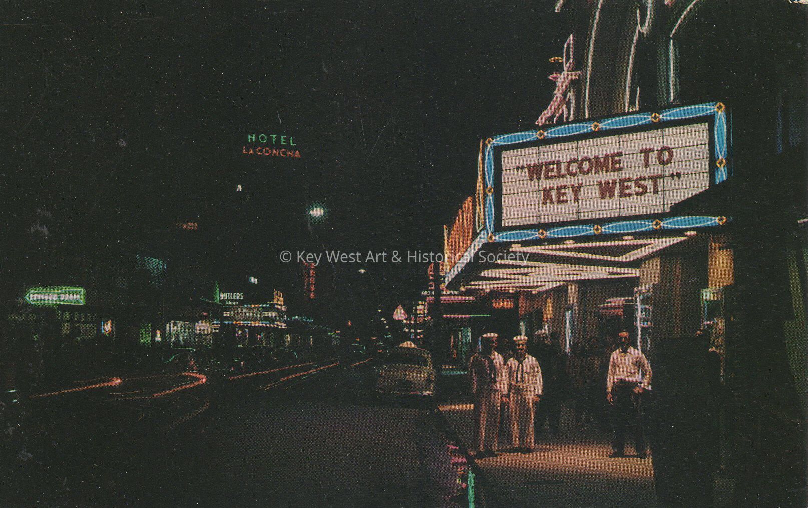Postcard depicting U.S. Navy sailors on the 500 block of Duval Street under the Strand Theater sign. The marquee reads, 'Welcome to Key West'. Notation on verso, 'This is famous Duval Street, the main stem in Key West, Florida. Enjoy promenading on Duval Street and listen to songs and music being played in open door cafes and restaurants.'Subject Person/Organization