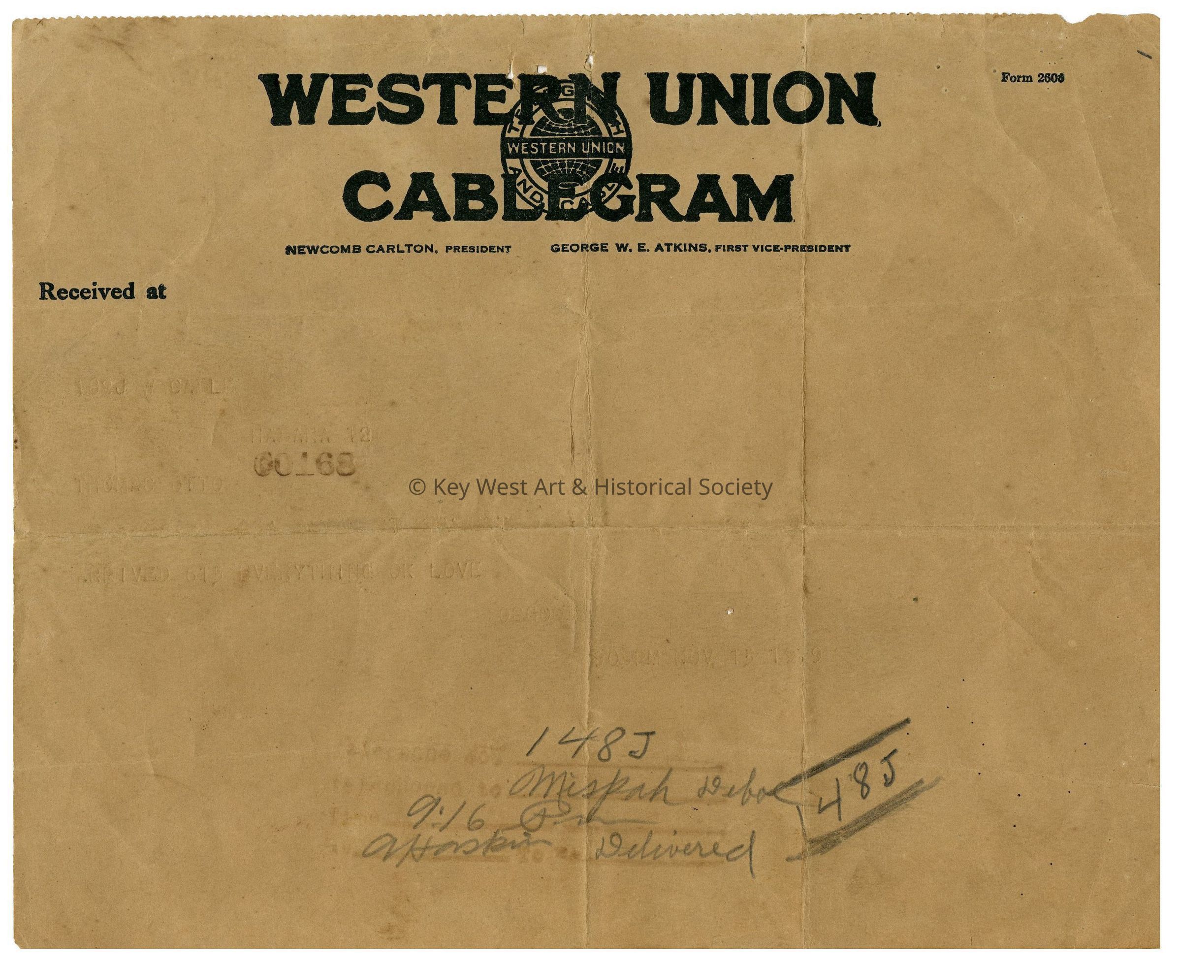 Cablegram from Western Union detailing the safe arrival of Dr. Thomas Otto in Cuba relayed to his family in Key West. Otto was flying from Colon, Panama to Bluefields, to Cuba, and then Key West. Signed for by Mispah Otto.Collection