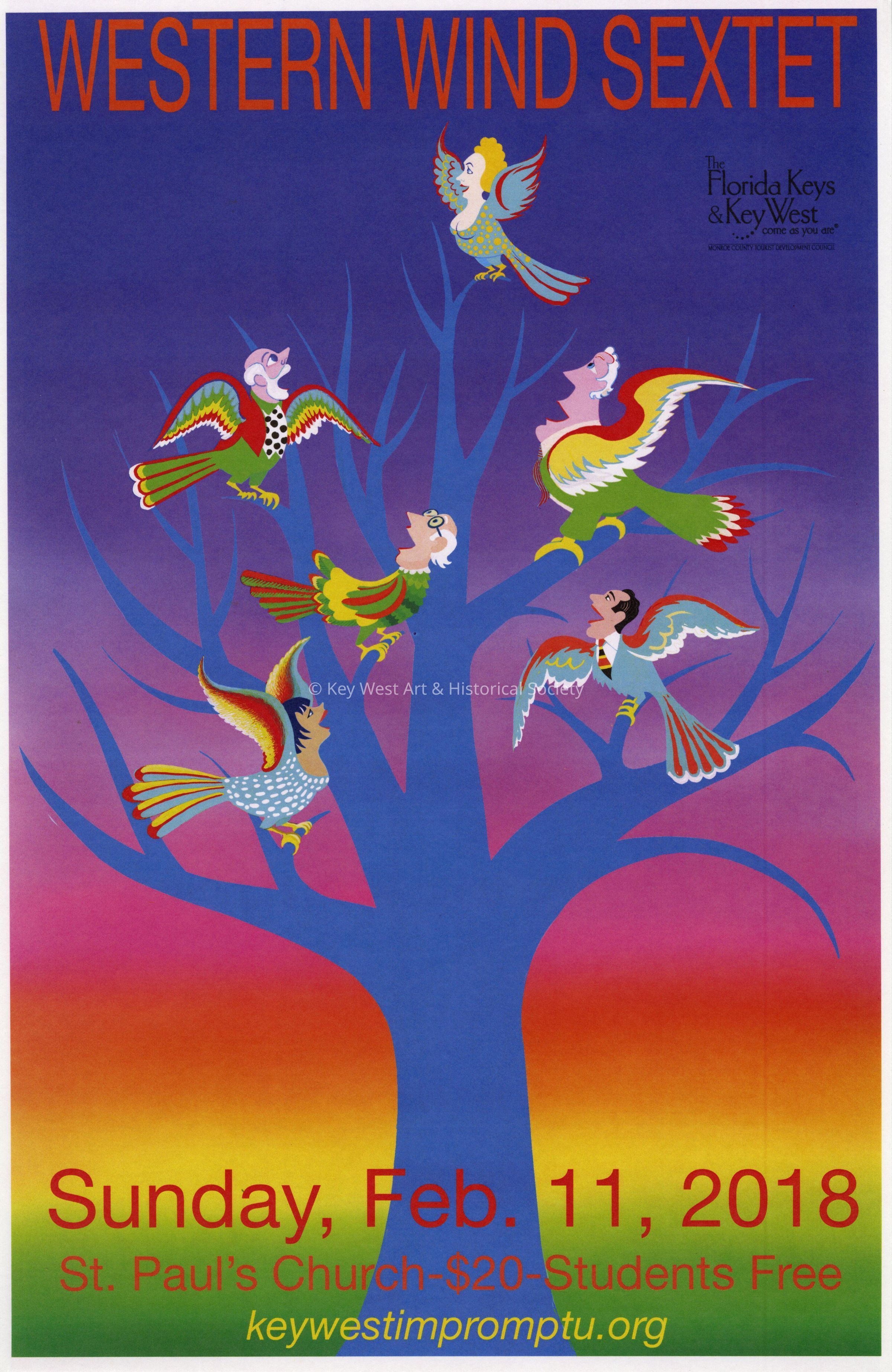 An advertising poster for Impromptu Classical Concerts featuring Western Wind Sextet. The concert took place on February 11, 2018 at St. Pauls Church in Key West.Collection