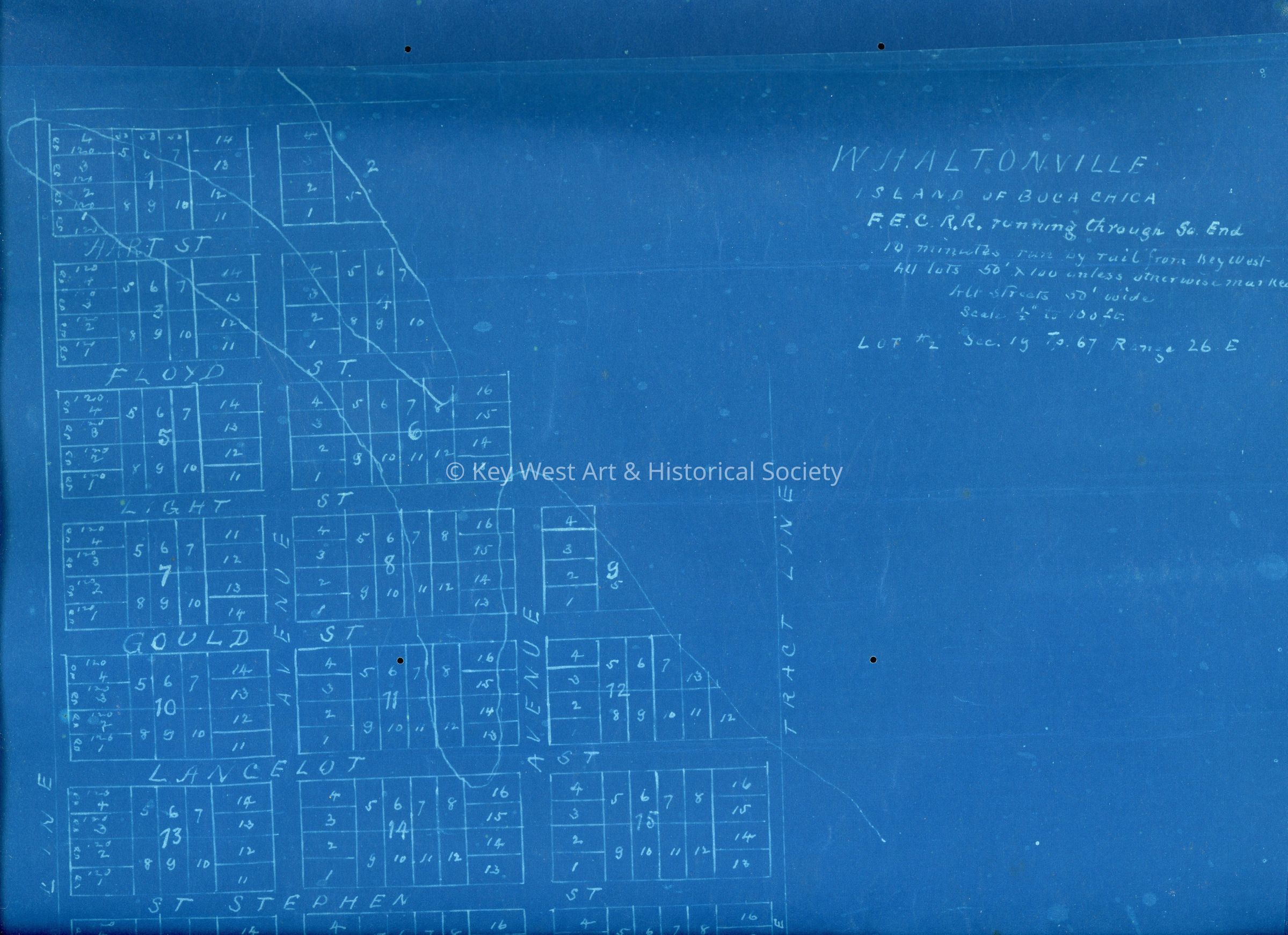 A blue plat map for the proposed development of Whaltonville on Boca Chica Key. The top right corner reads 'Whaltonville / Island of Boca Chica / F.E.C.R.R. running through So. End / 10 minutes run by rail from Key West / All lots 50' X 100 unless otherwise marked / All streets 50' wide / Scale 1/2" to 100 ft. / Lot #2 Sec. 19 To 67 Range 26 E.' The development of Whaltonville never occurred.