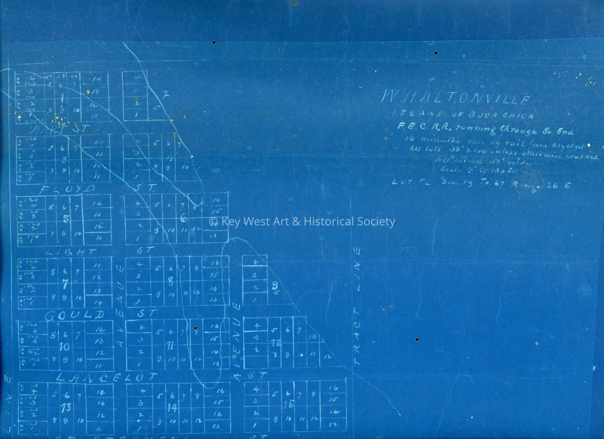 A blue plat map for the proposed development of Whaltonville on Boca Chica Key. The top right corner reads 'Whaltonville / Island of Boca Chica / F.E.C.R.R. running through So. End / 10 minutes run by rail from Key West / All lots 50' X 100 unless otherwise marked / All streets 50' wide / Scale 1/2" to 100 ft. / Lot #2 Sec. 19 To 67 Range 26 E.' The development of Whaltonville never occurred.