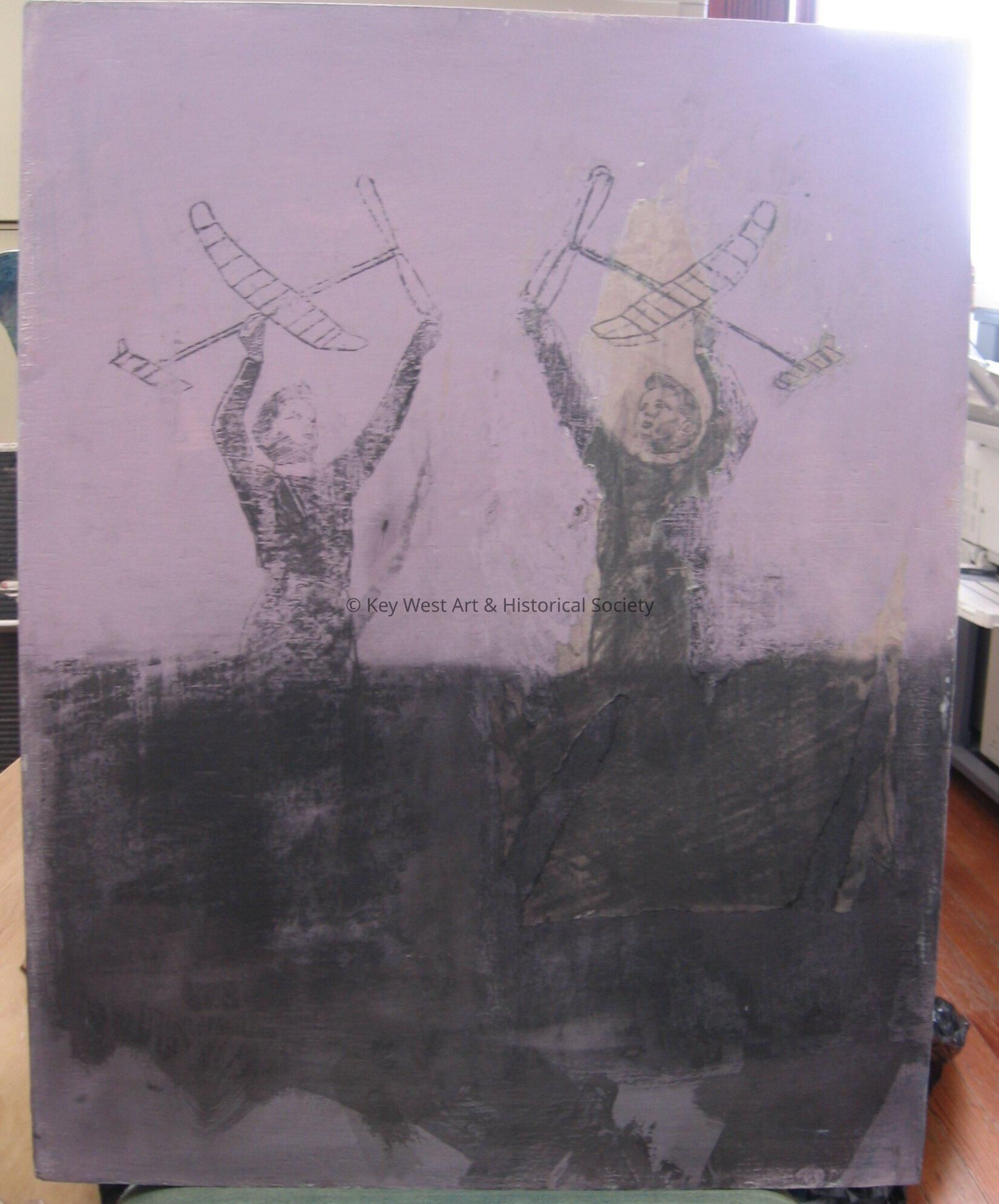 Mixed media on panel. Image of 2 boys holding toy planes.Collection