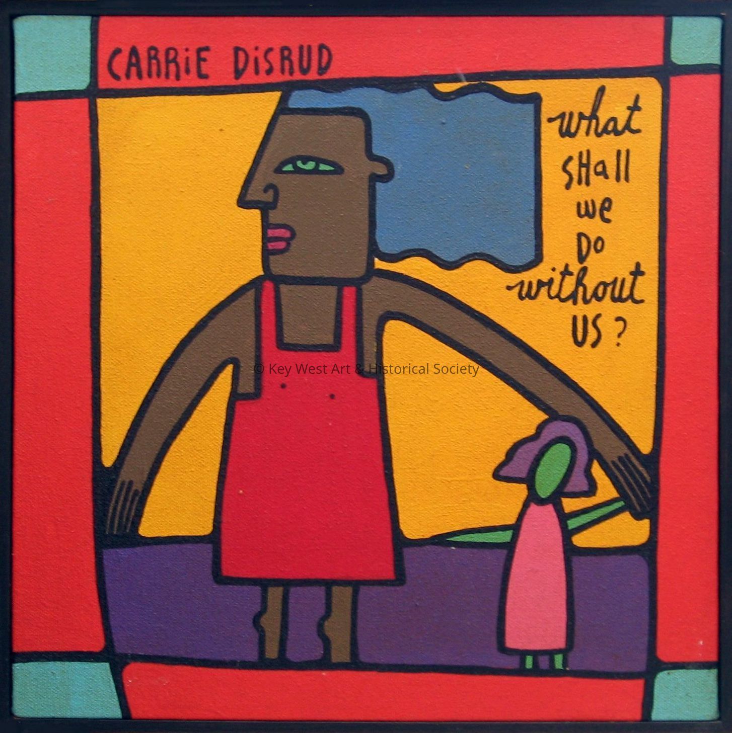Acrylic on canvas by Carrie Disrud depicting a tall woman dressed in red standing alongside a short girl dressed in pink.Type of Painting