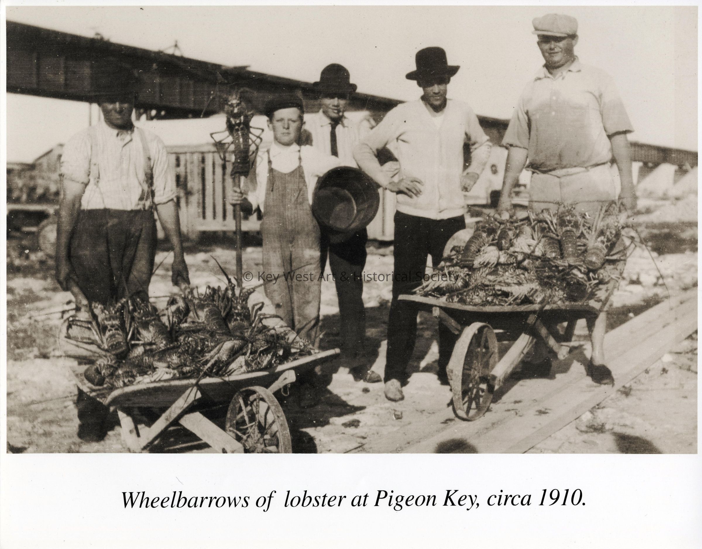Black and white photograph of unknown men with wheelbarrows full of lobster.