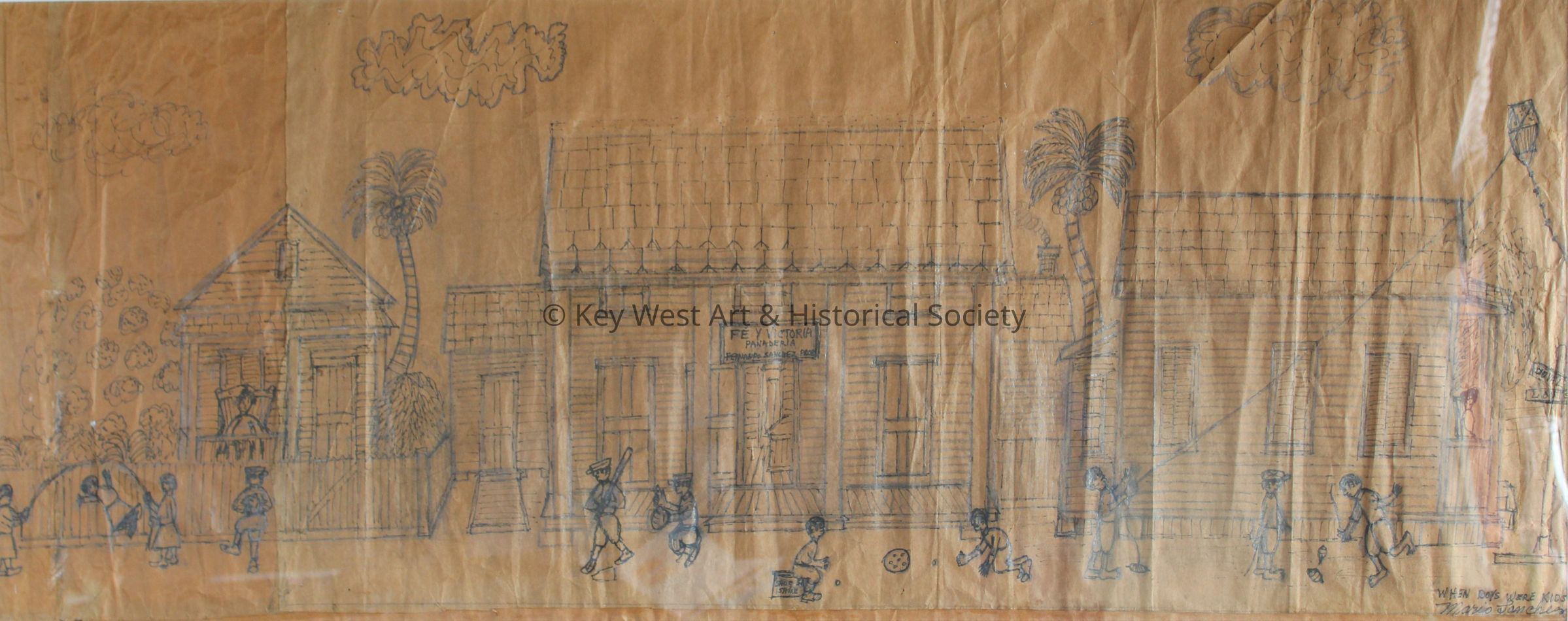 Pencil sketch on an unfolded paper bag by Mario Sanchez of a typical Key West street scene the corner of Duval and Louisa streets. Groups of boys and girls are playing games on Louisa street in front of Fe y Victoria Panaderia including baseball, kite flying, jump rope, and spinning tops.Type of Drawing