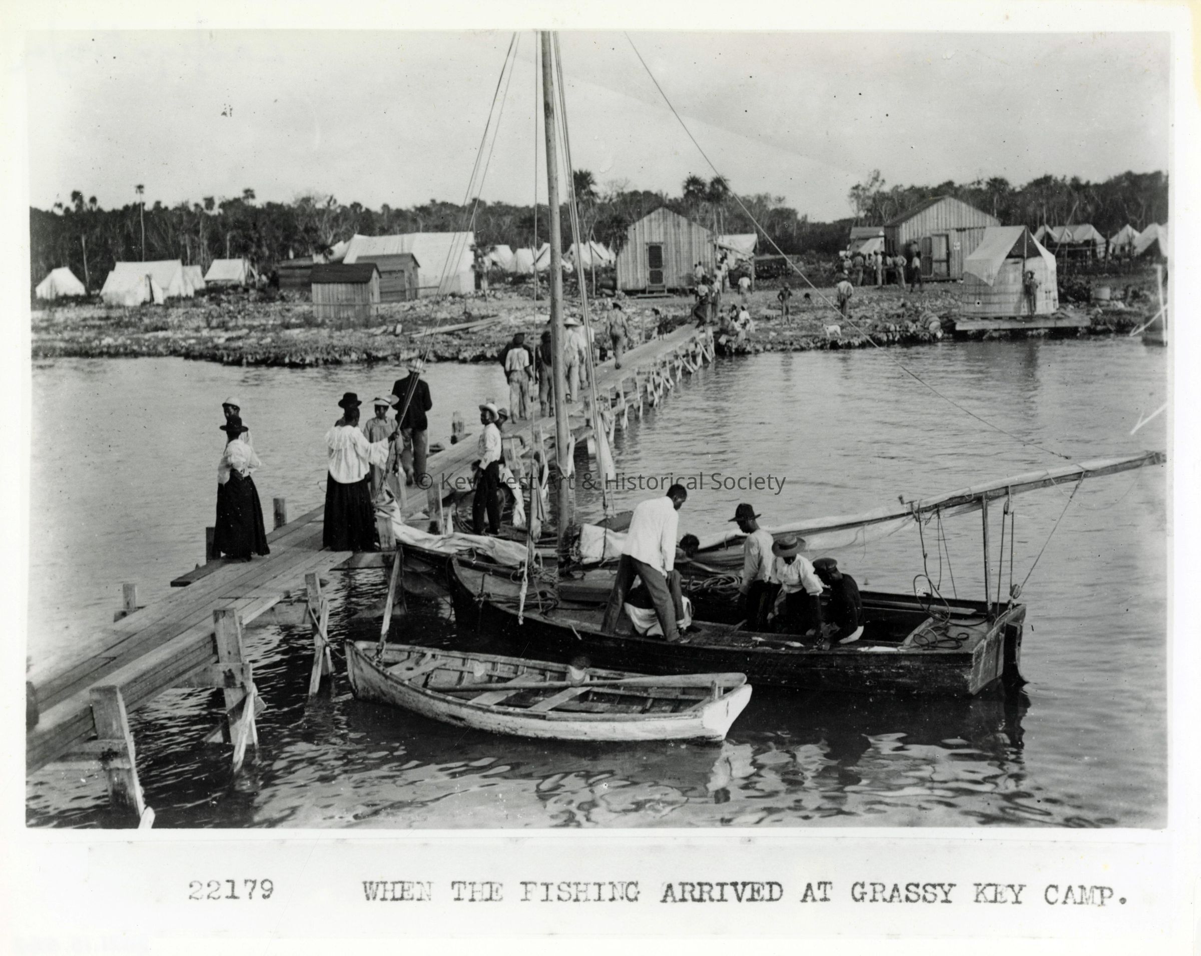 Black and white photograph of a fishing sloop arriving and unloading fish at the Florida East Coast Railway camp at Grassy Key.