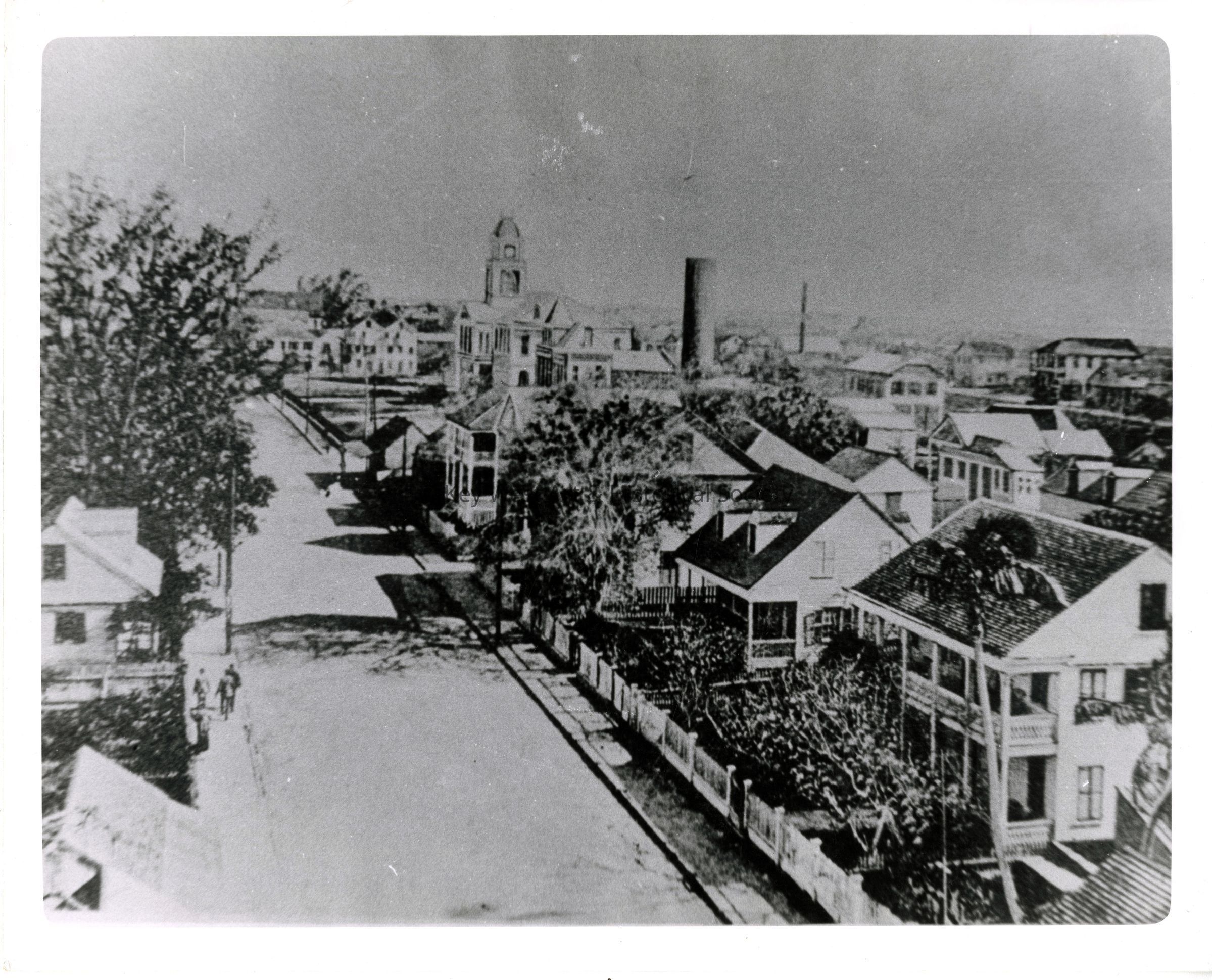 Black and white photograph of Whitehead Street looking south. The Monroe County Courthouse and Jail are visible in the center.