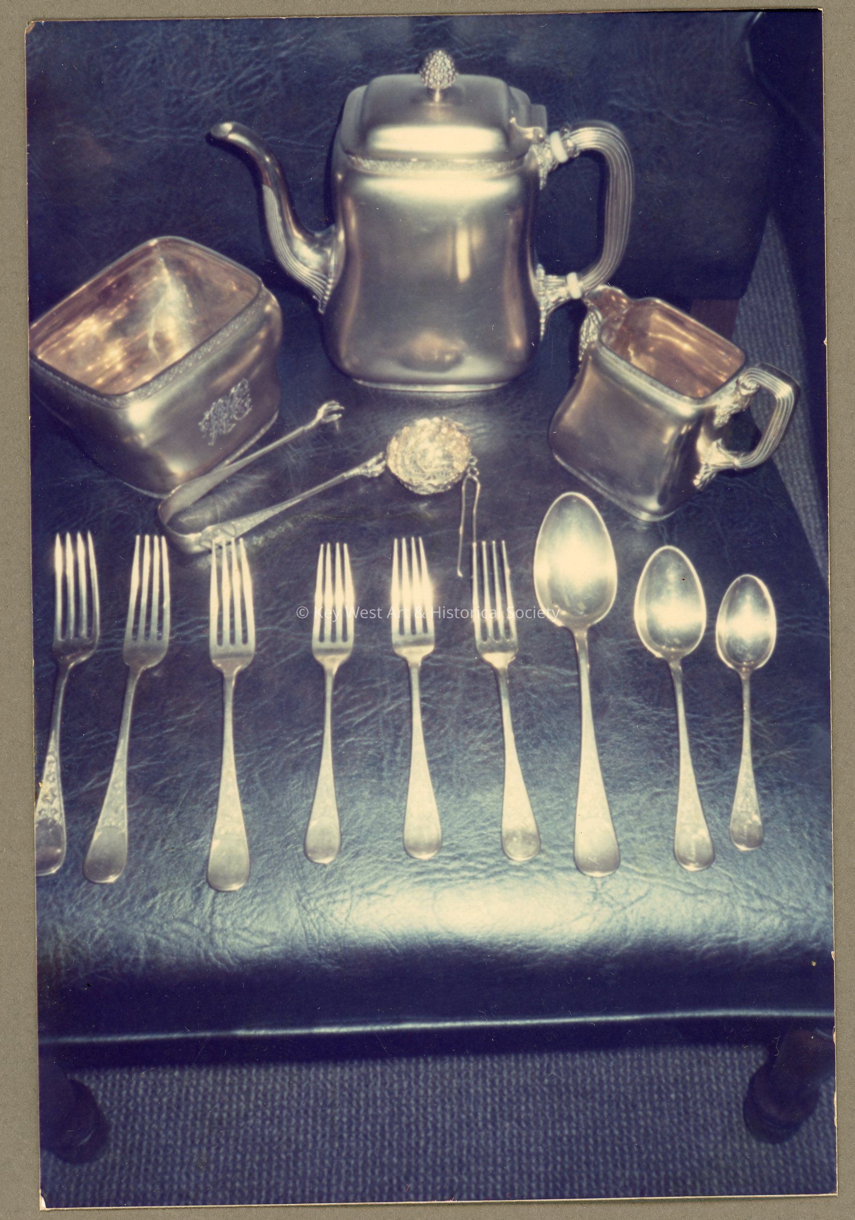Color photograph of the Curry gold service set purchased from Tiffany & Co. in New York City by William Curry. The photographed portion of the set was loaned by Miss Minnie-Porter Harris to Florida First National Bank of Key West, formerly located at 420 Front Street. The photograph was used as a display in Wachovia Bank (at the same location).
