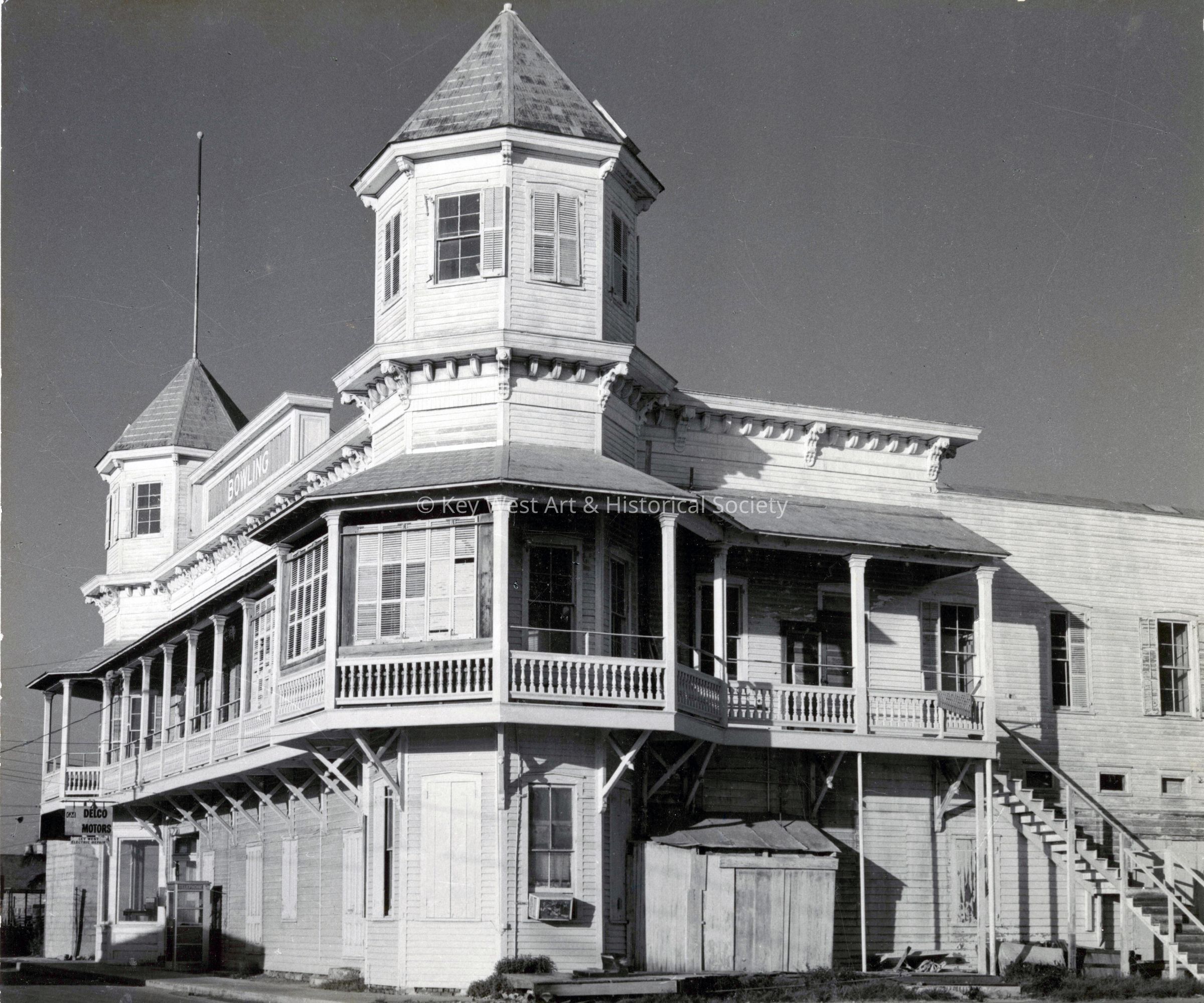 Black and white photograph of the William Curry & Sons building on the corner of Front Street and Simonton Street. A bowling alley was located on the second floor. The building burned down in 1963.