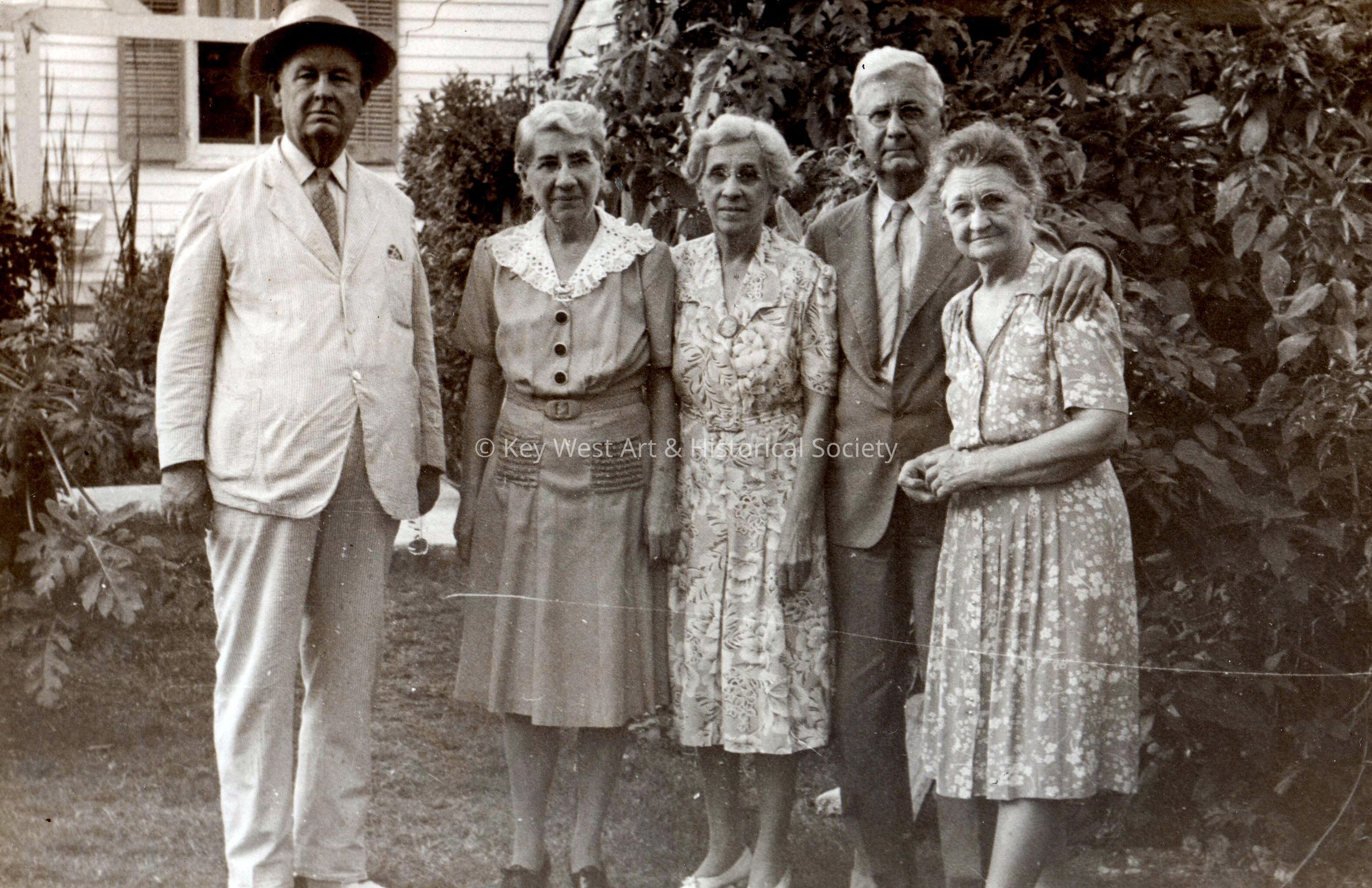 Black and white photograph of William Wellesley Demeritt Sr., his wife Claudia A. Albury Demeritt and unknown people. Demeritt served as Key West Lighthouse Keeper.