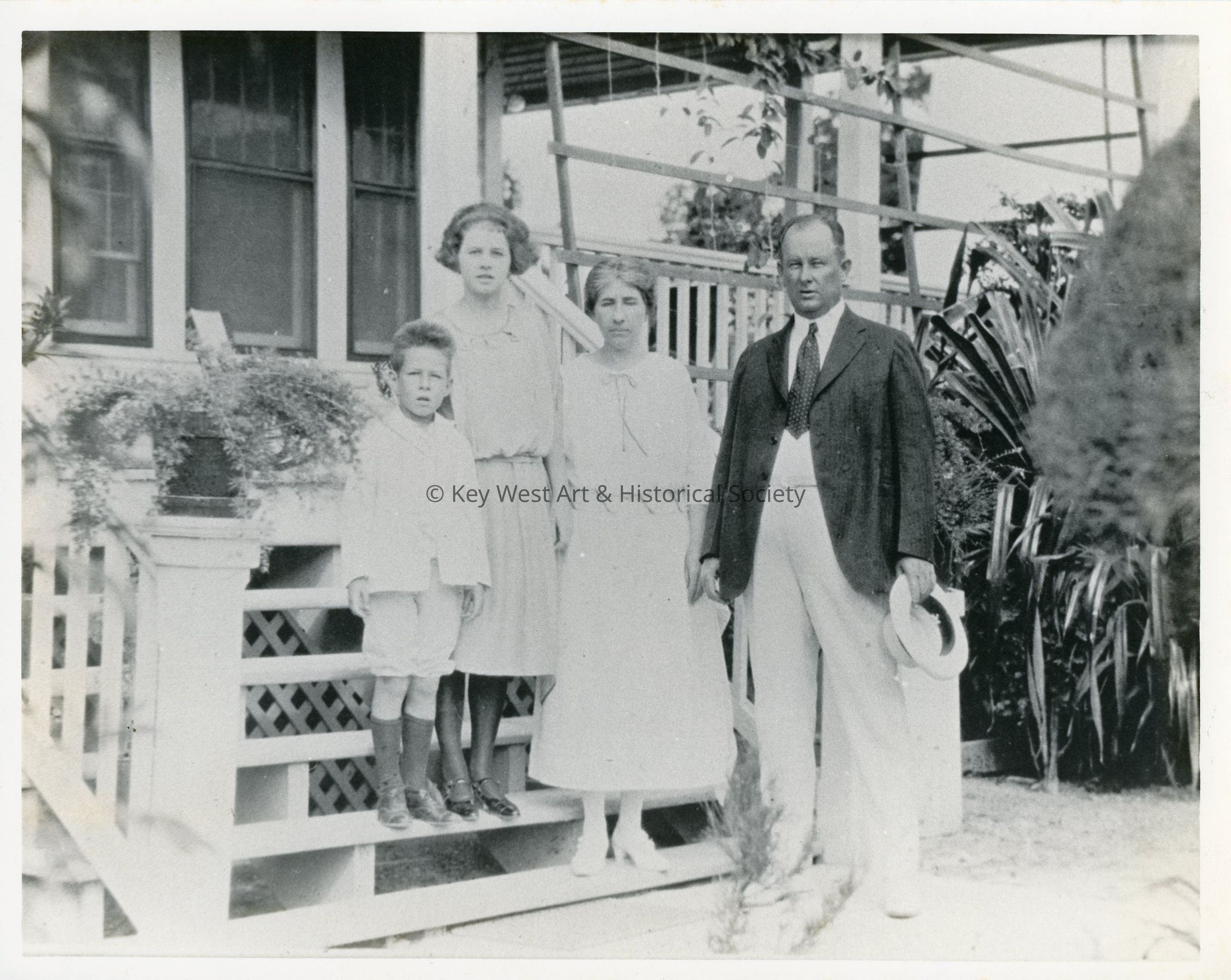 Black and white photograph of William Demeritt and his family standing on the stairs of the Key West Lighthouse Keeper's Quarters house.