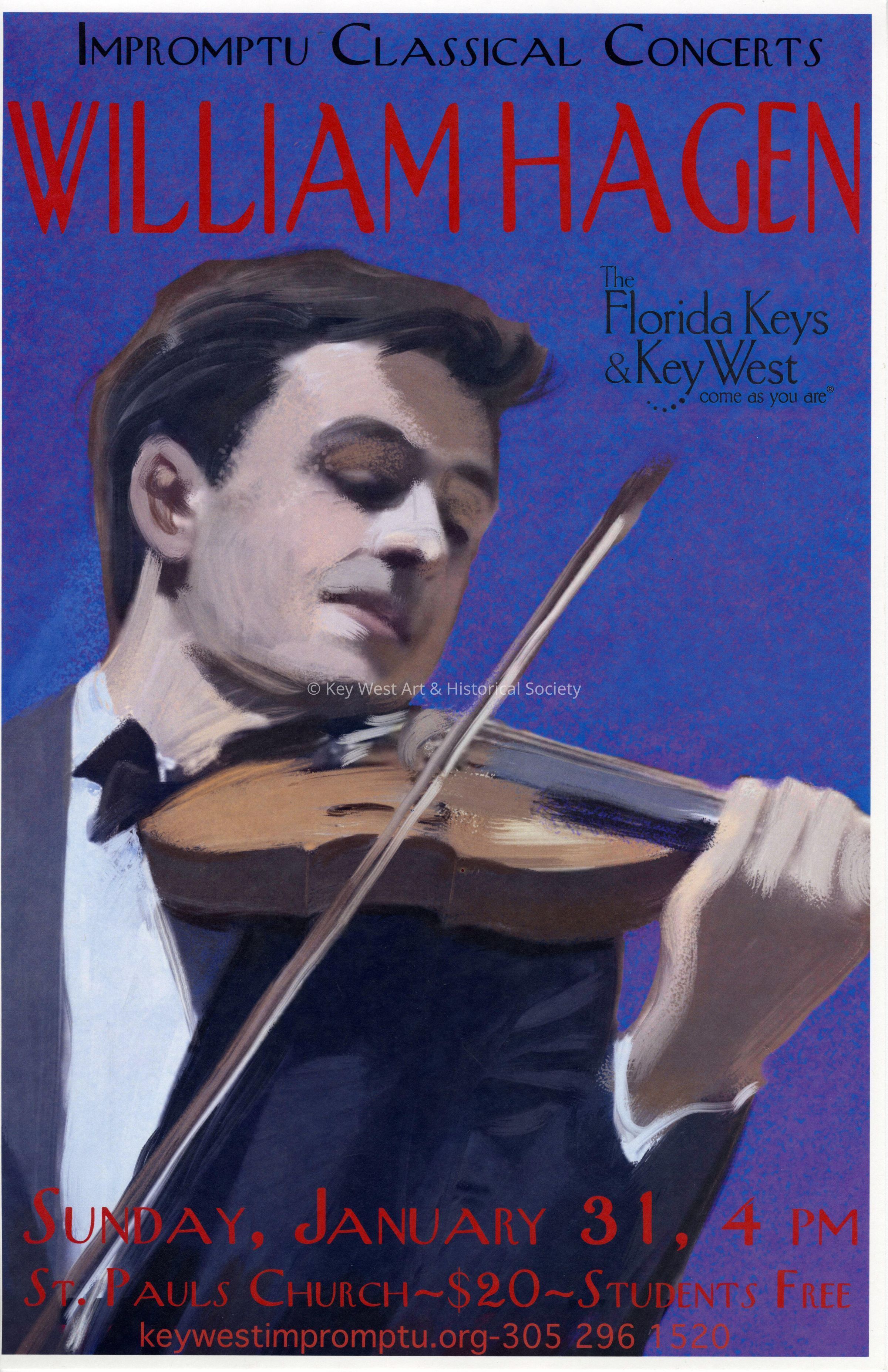 An advertising poster for Impromptu Classical Concerts featuring William Hagen. The concert took place on January 31, 2016 at St. Pauls Church in Key West. The poster was designed by Lawrence Anthony.Collection