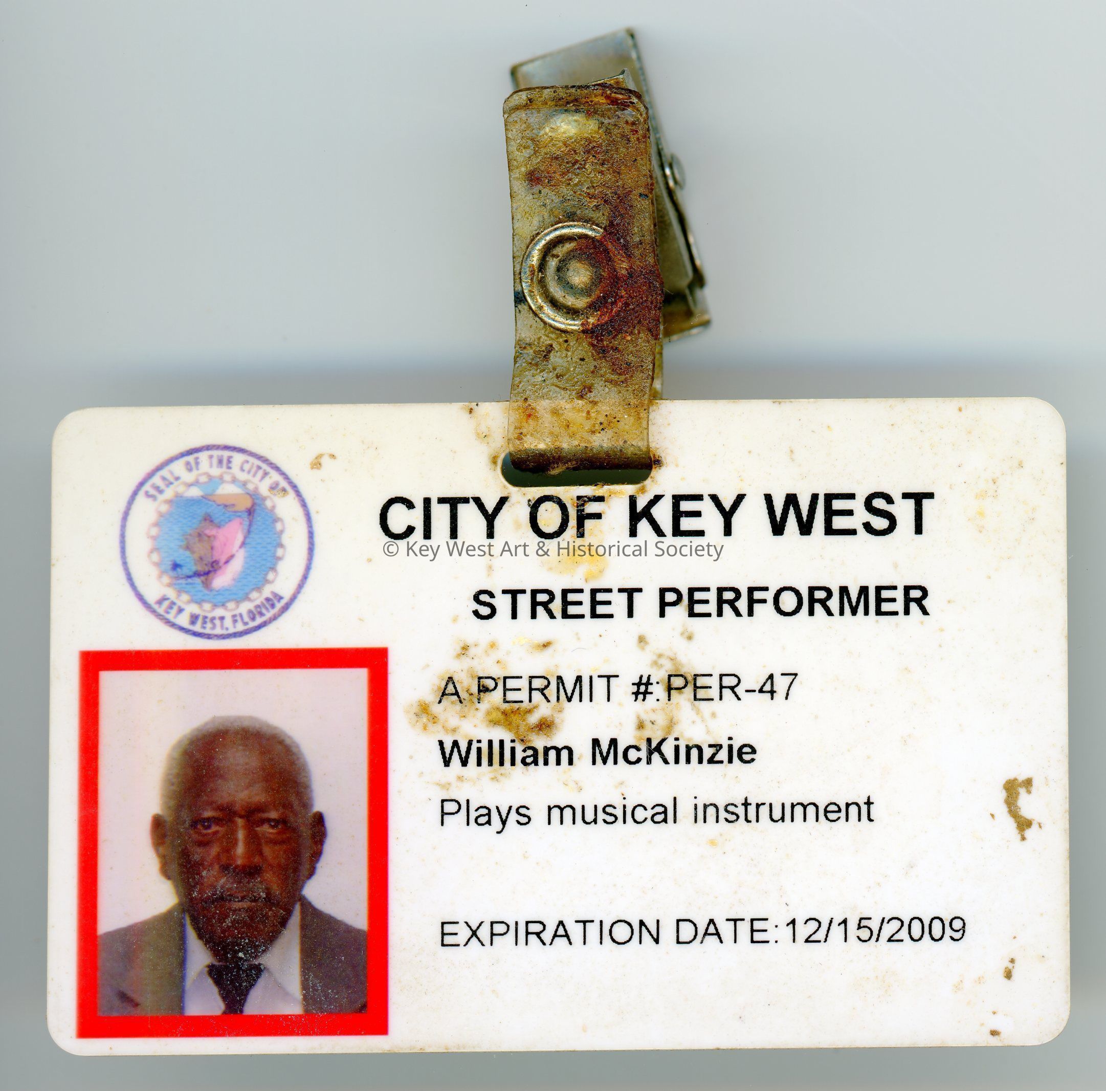 A clip on street performer permit badge issued by the City of Key West belonging to William McKinzie. The badge gave McKinzie permission to play a musical instrument on city streets through December 15, 2009.Collection