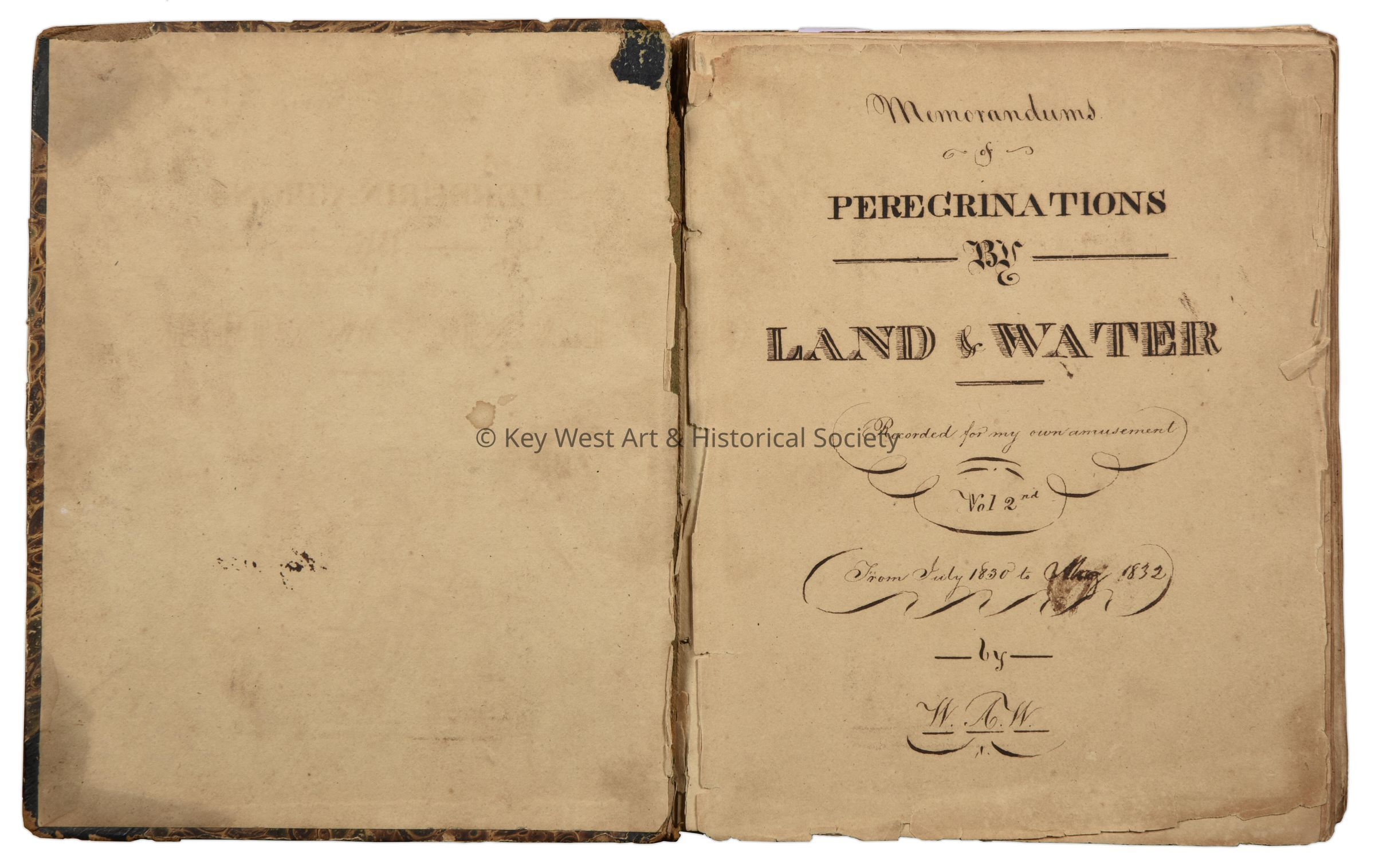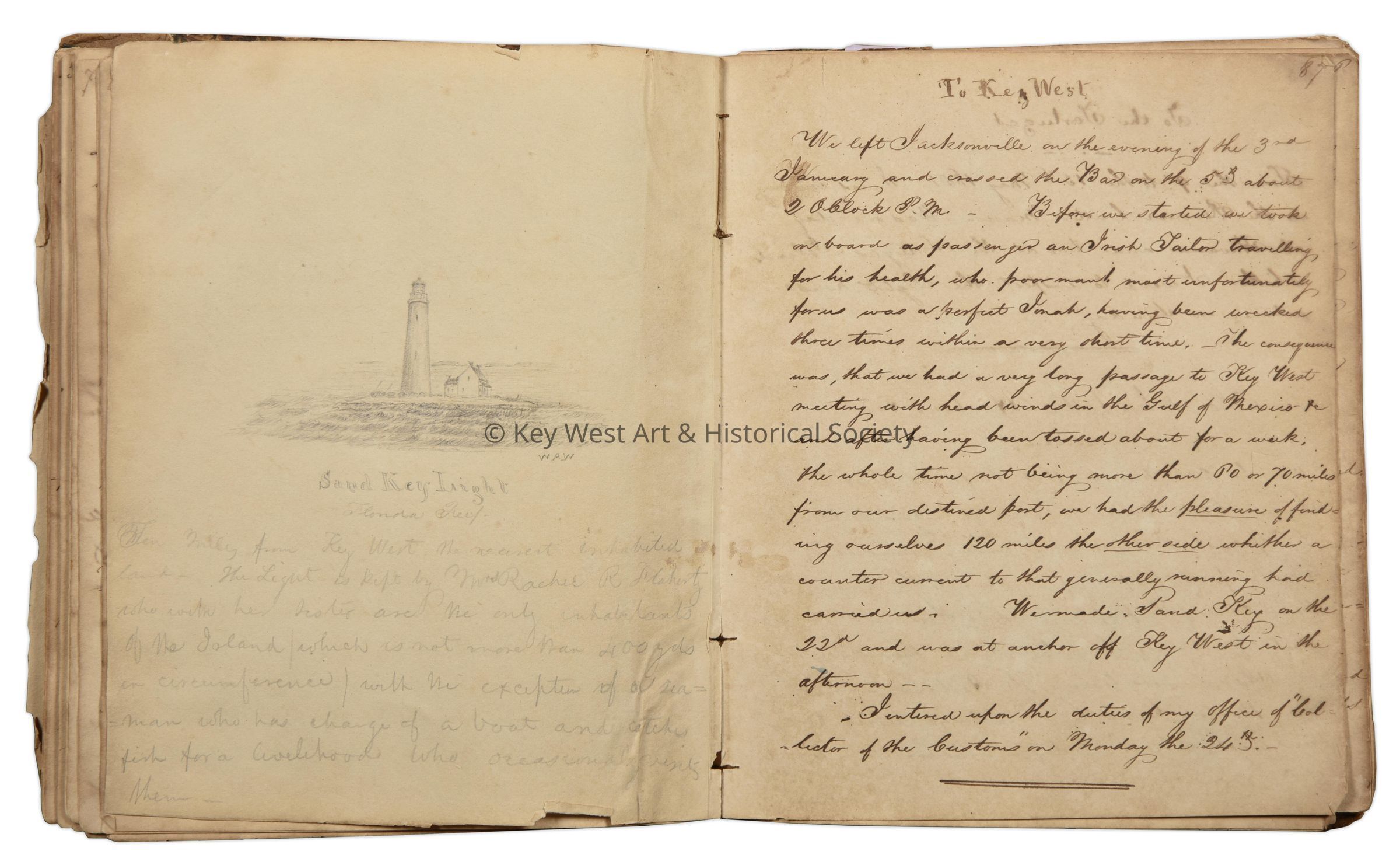 One of a set of four diaries kept by William Whitehead title 'Memorandums of Peregrinations by Land & Water recorded for my own amusement'. The volumes contain excerpts from books, poems, sketches and his own personal experiences. In this volume, Whitehead wrote about his voyage to Key West which also contains a sketch of the original Sand Key Lighthouse.