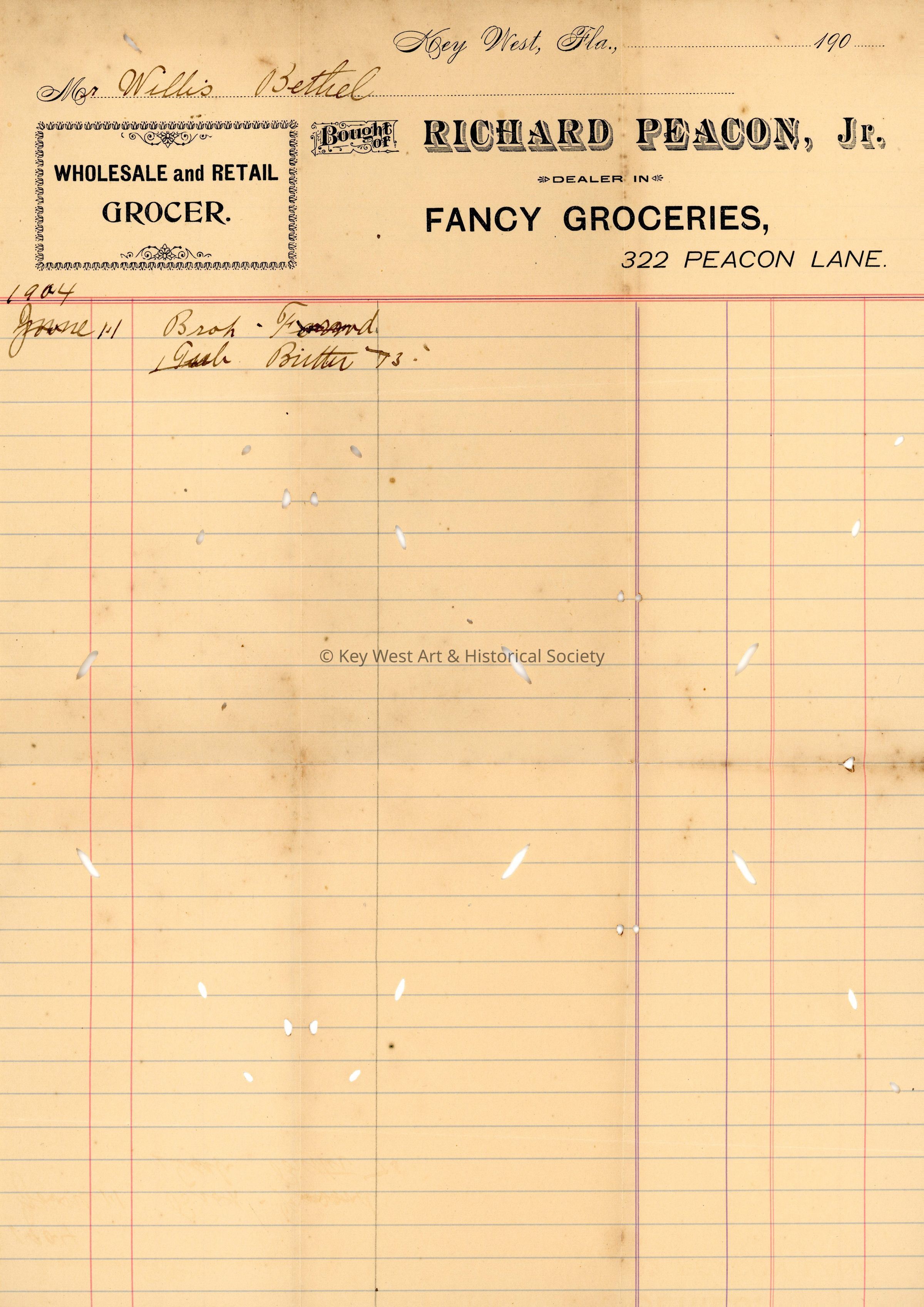 Single page from a ledger for Richard Peacon's grocery formerly located at 800 Fleming Street. The page is dedicated to purchases made by Willis Bethel. Header for the page reads 'Bought of Richard Peacon, Jr. Dealer in Fancy Groceries, 322 Peacon Lane.'Collection