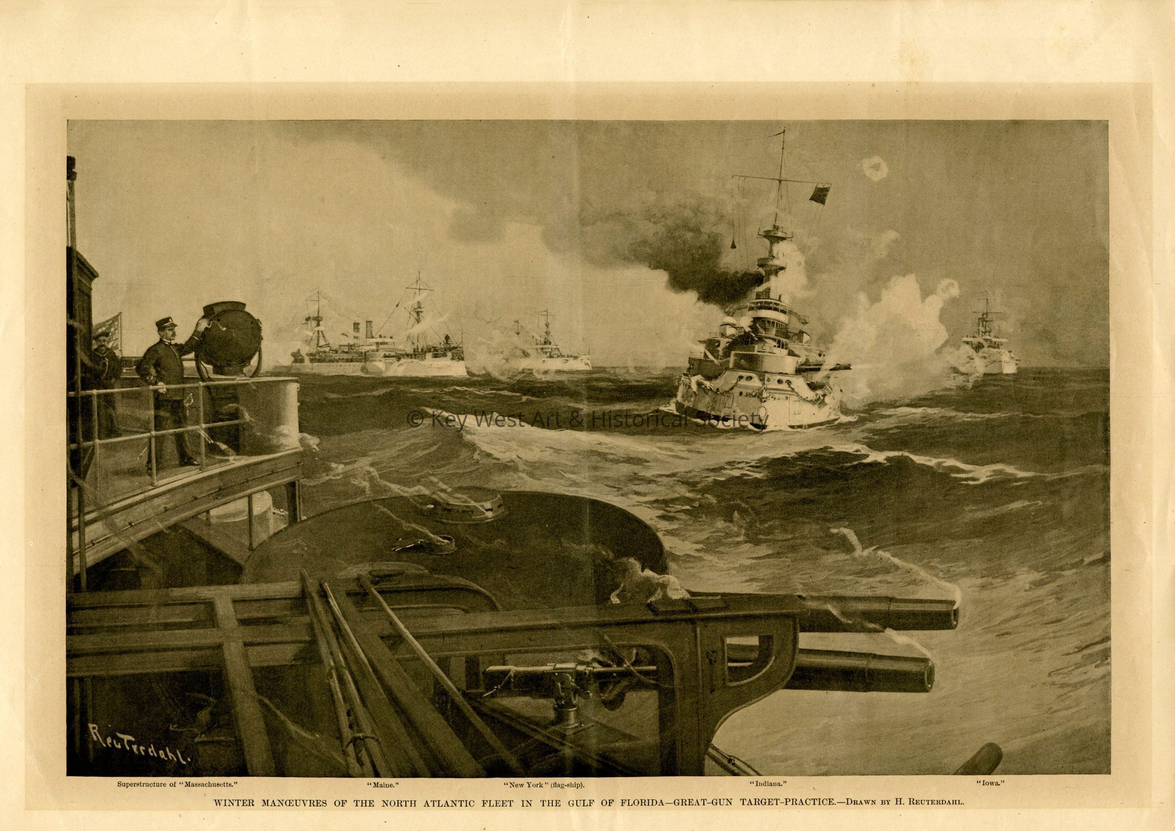 Harper's Weekly, Volume 42. Issue 2145, January 29, 1898 with caption 'Winter Maneuvers of the North Atlantic Fleet in the Gulf of Florida - Great Gun Target Practice'. Ships pictured USS MASSACHUSETTS, USS MAINE, USS NEW YORK, USS INDIANA, and USS IOWA.Collection