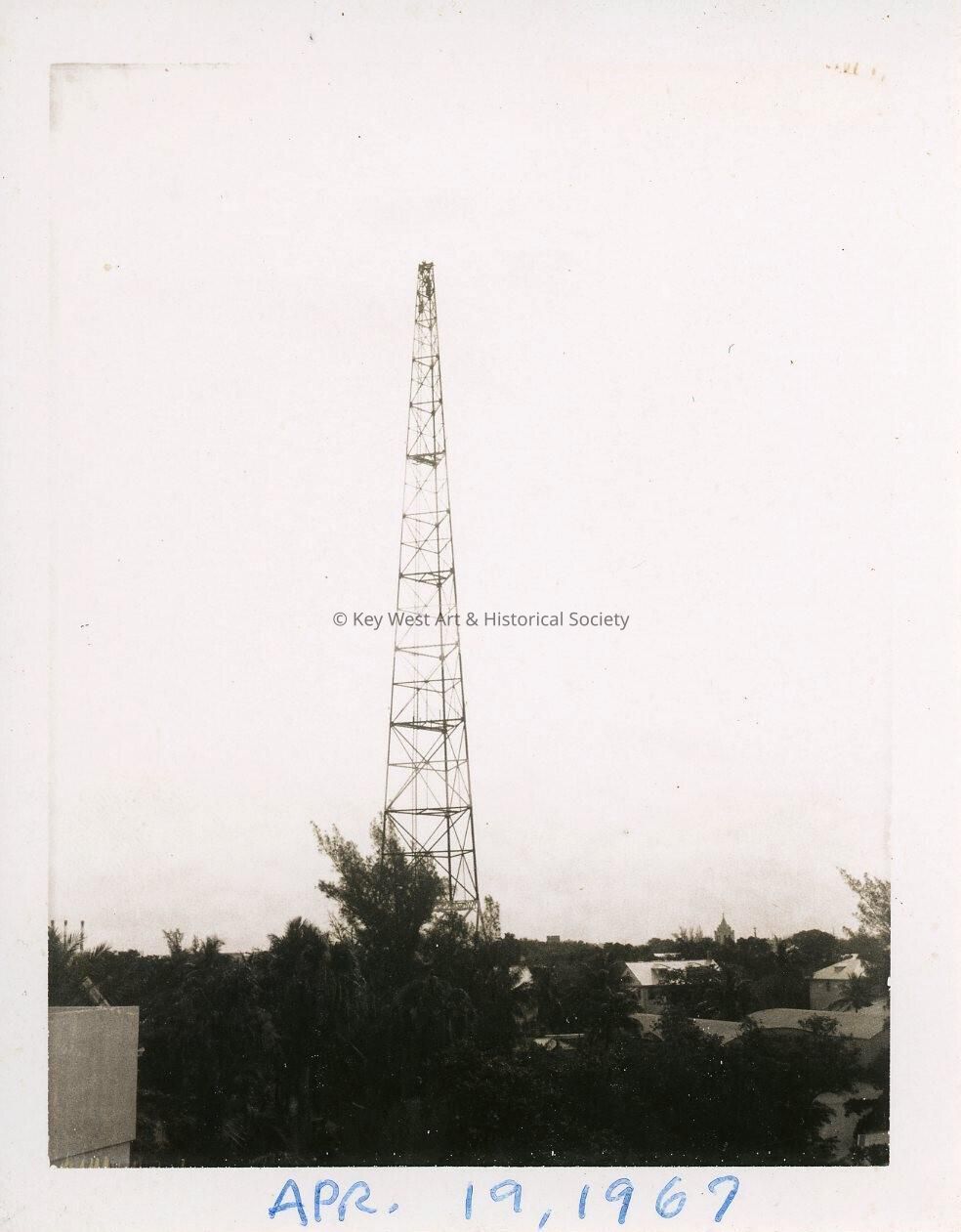 Black and white photograph of one of the wireless telegraph towers at Naval Station Key West. Pictures were taken before it was shortened to 200 feet.