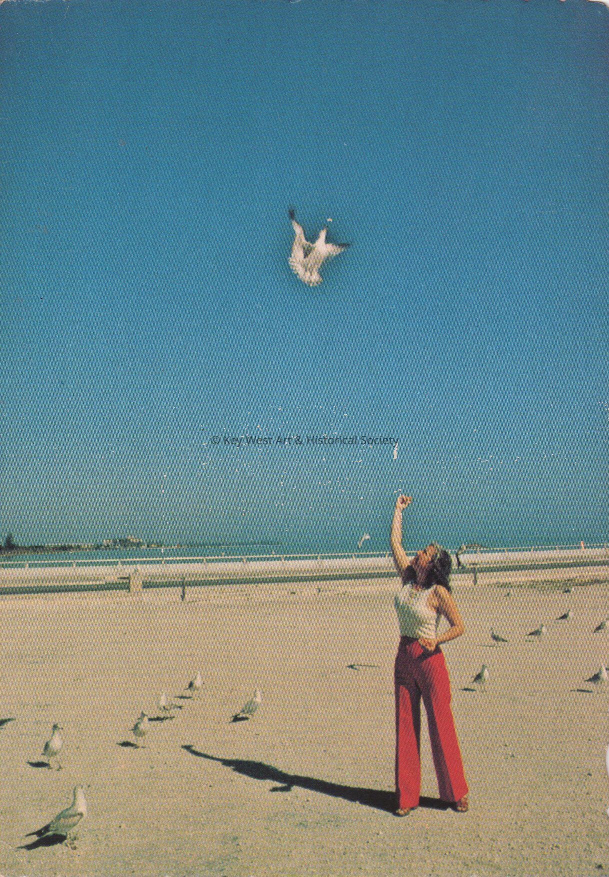 Postcard depicting a woman feeding seagulls on a beach. The description on the verso reads, ‘Seagulls quickly gather to catch a snack when they see someone throwing food for them. Most morsels are caught before they reach the ground. Key West, Florida.'Subject Place