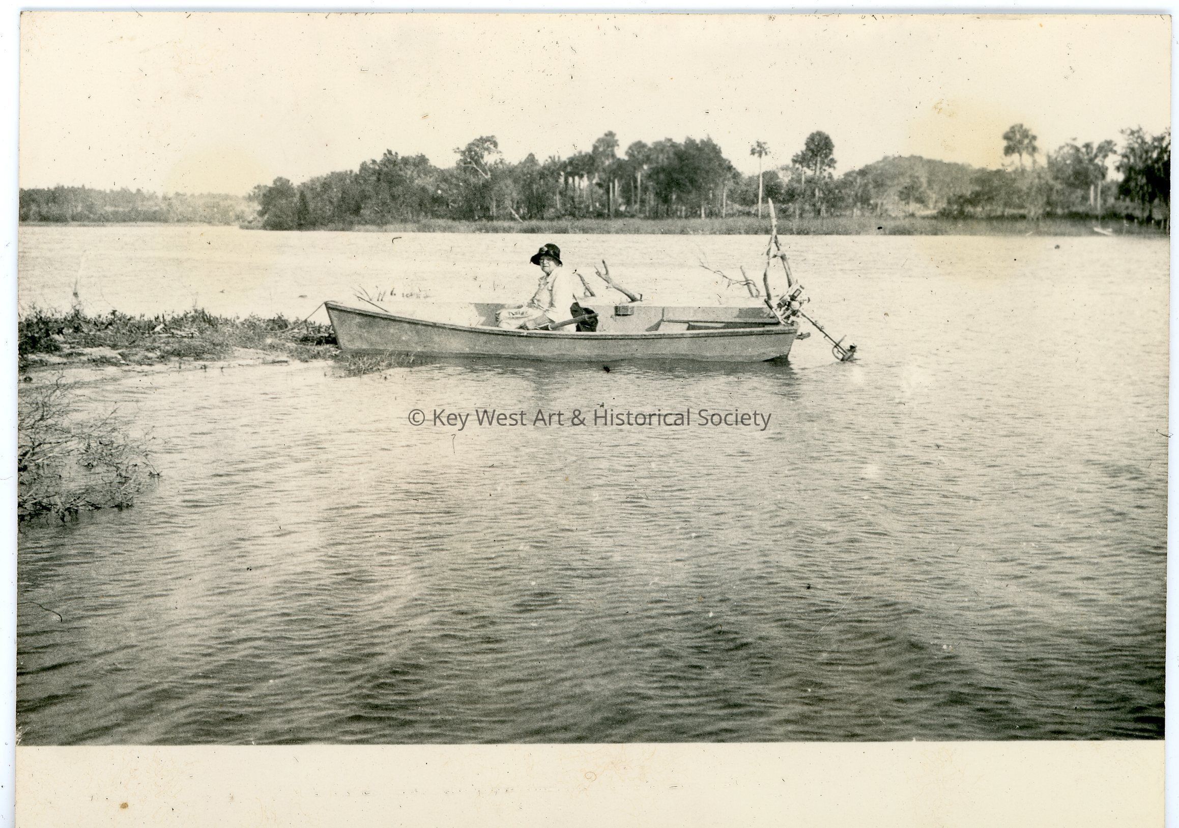 Black and white photograph of a woman wearing a cloche hat in a small motor boat. The photo was part of a photograph album began by Victor H. Baker in 1940.