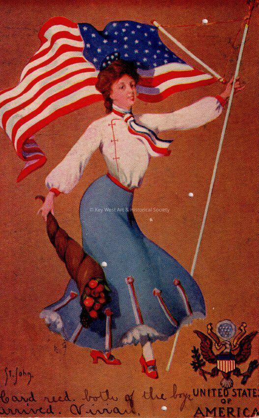 Postcard depicting a woman with roses and an American flag, near the Seal of United States of America. The message on the front reads, ‘Card received. Both of the boys arrived. Vivian’. The card is addressed to Mrs. John W. Hattrick, 2012 Latona Street, Southwest Station, Philadelphia, Pennsylvania, and is postmarked Key West, December 4, 1906.Collection