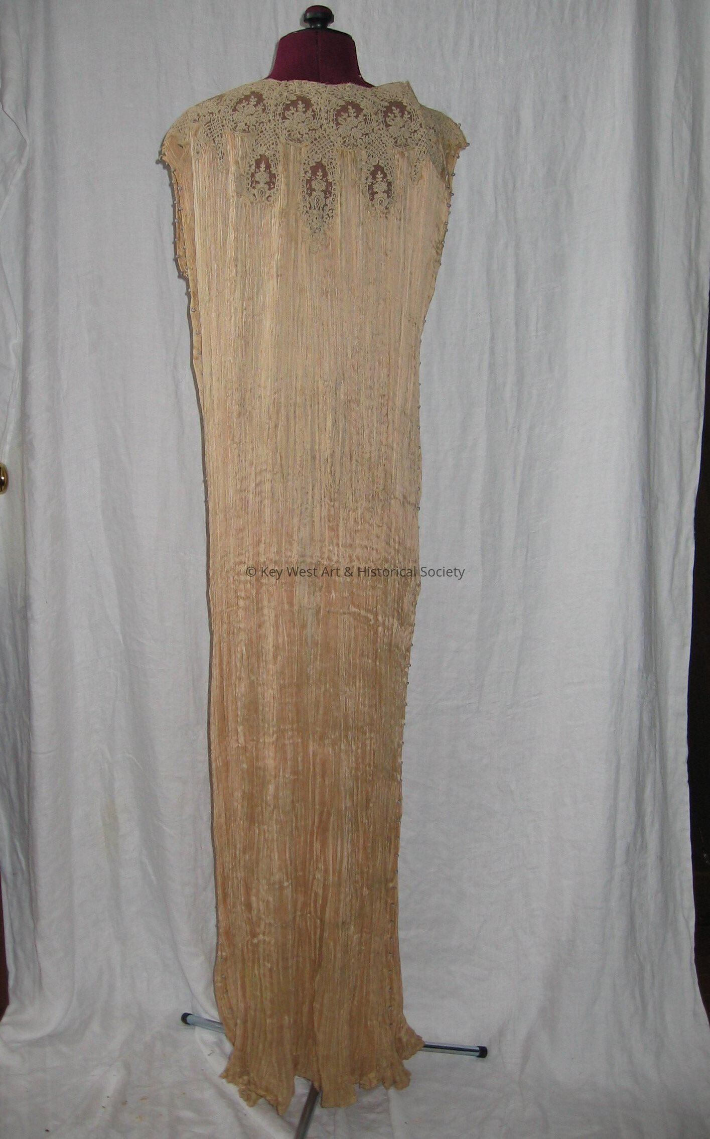 Handmade full-length sleeveless peach colored satin gown with lace trimming around the neck line. Back of gown is low cut with lace trimming. Sides of gown are held together with beads.