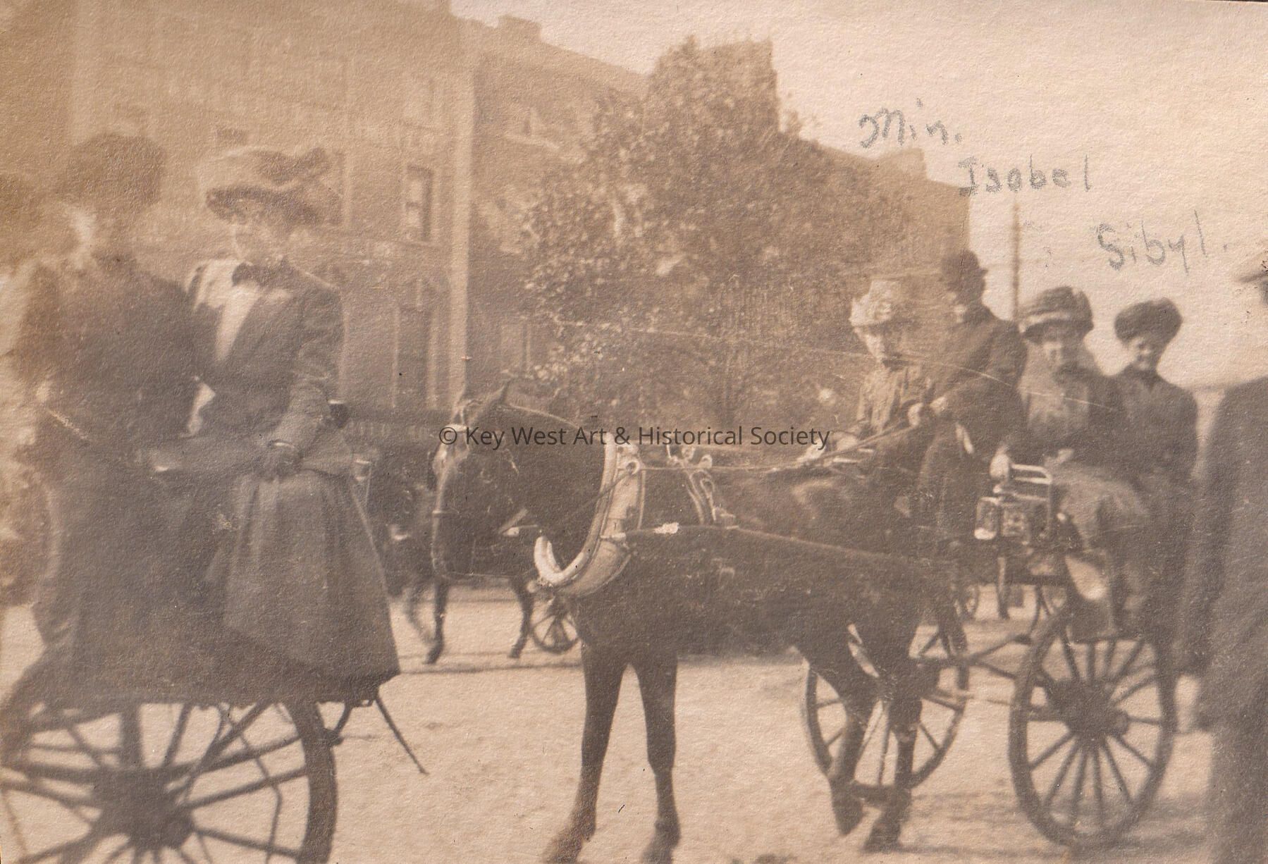 Women (including Min, Isabel, and Sibyl) in horse-drawn carriages.Collection