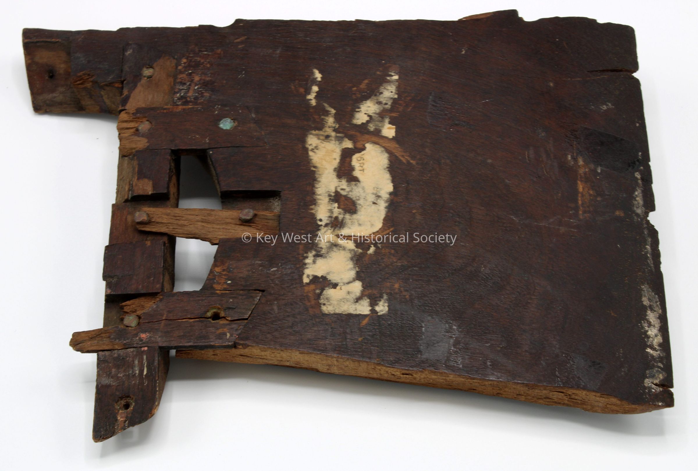 Odd shaped wood fragment with nails attached. Penciled on the back: "Blown up Feb 1898 USS Maine".Collection