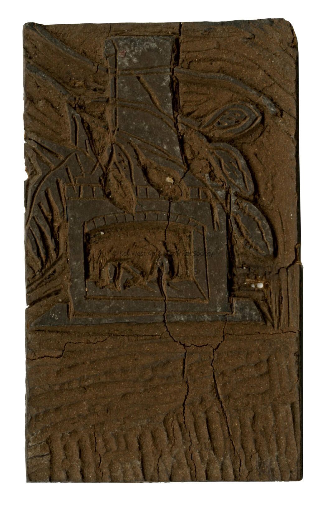Woodcut block of an outdoor fireplace surrounded by tropical foliage.