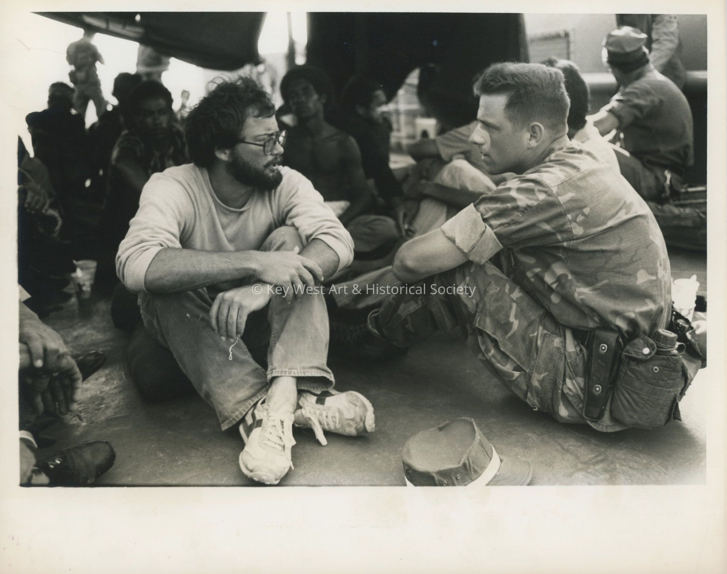 Black and white photograph of Sergeant Brian P. Caples speaks with a Cuban man aboard the LCU 1659. He and 31 others abandoned their vessel as it developed mechanical issues crossing the Florida Straights. The USS Saipan and the USS Boulder carried out search and rescue operations in the Straights of Florida at the direction of President Jimmy Carter.