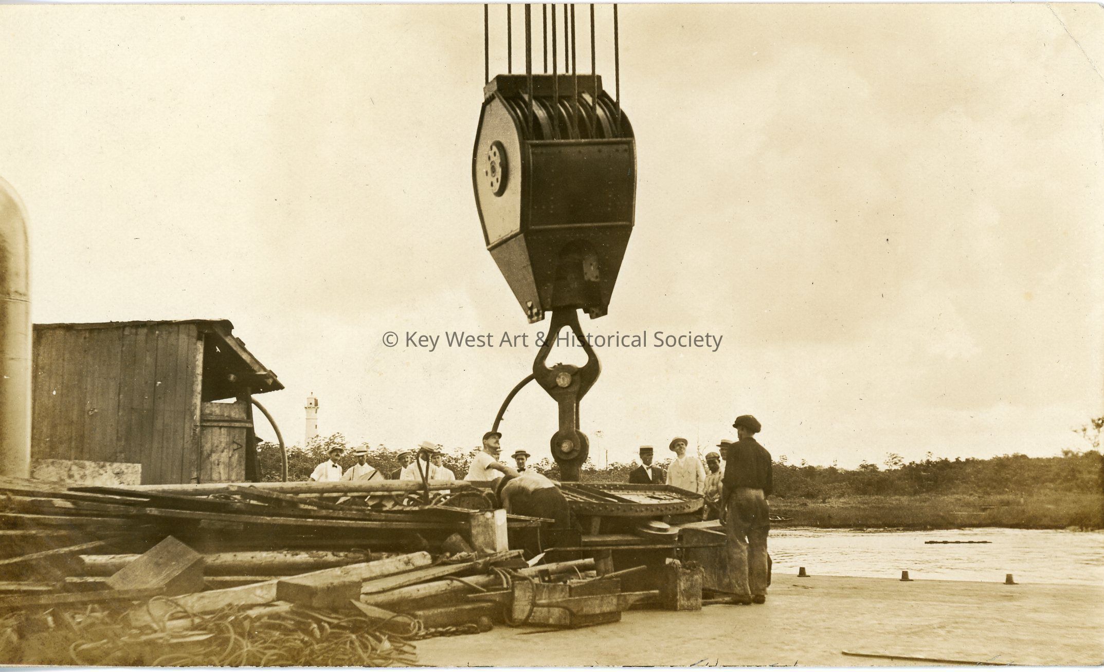 Photograph depicting a group of unknown men standing beneath and behind the hook of a crane. On the ground in front of the men is lumber and rope. The photograph was designed to be attached to a postcard backing.