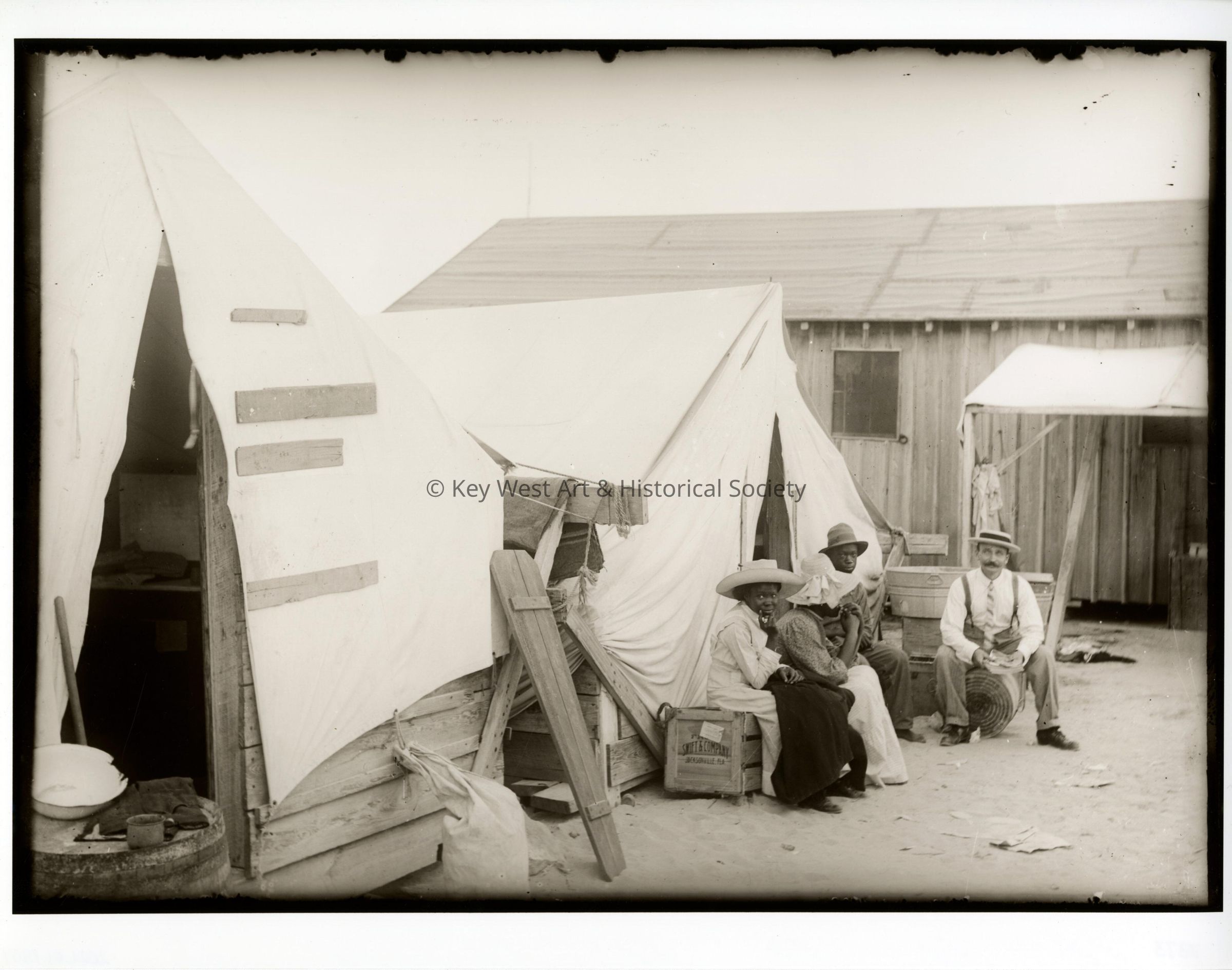 Black and white print taken from a dry plate glass negative of four unknown people (two men and two women) in front of the workers' tent at the railroad camp on Pigeon Key. The building in the background is the commissary. The image was taken during the construction of Seven Mile Bridge on the Overseas Railway.