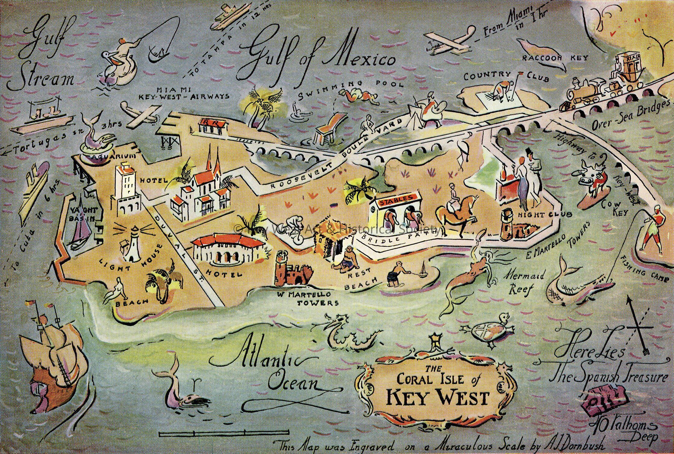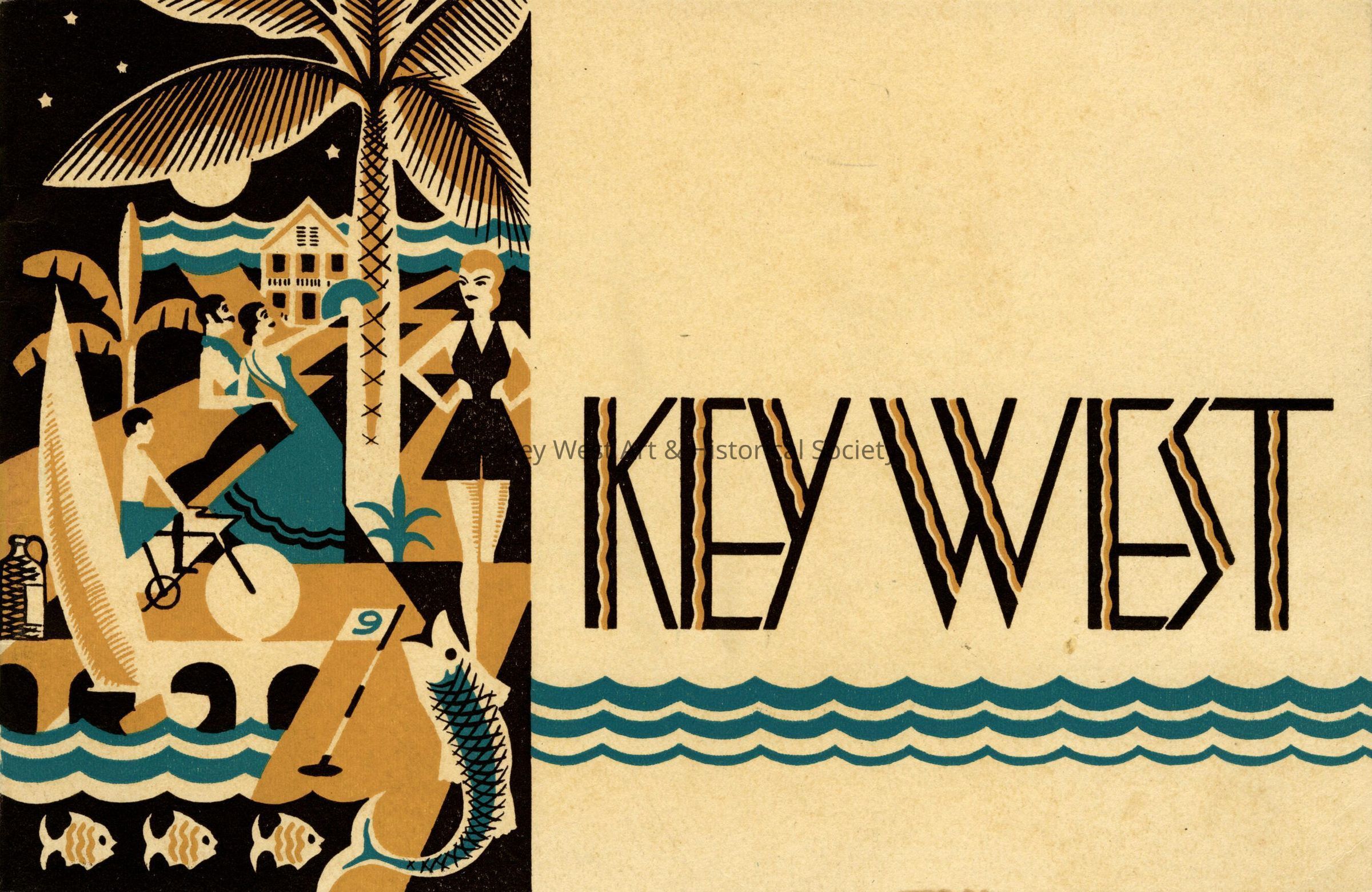 A 32-page color guidebook produce by The WPA Administration in Key West in order to entice tourists to visit America’s only Caribbean city. In addition to descriptions of the area, this guidebook contains reproductions of the artwork created by artists Avery Johnson, Stanley Wood, Richard Sargent, Richard Jansen, Klir Beck, and A.J. Dornbush. The pages describe the art, architecture, weather, flora, fauna, fishing, and a list of pertinent information about transportation and accommodations. There is a centerfold map of the lower Florida Keys.Collection
