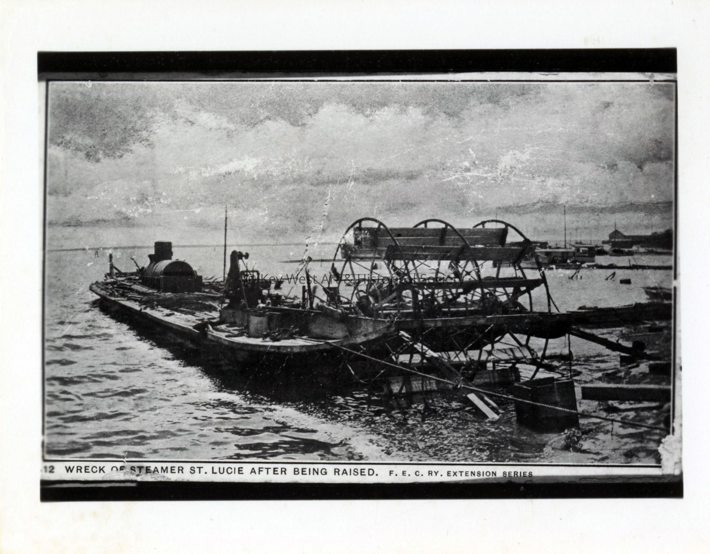 Black and white photograph of the wreck of the steamer ST. LUCIE belonging to the Florida East Coast Railway after the ship was raised.