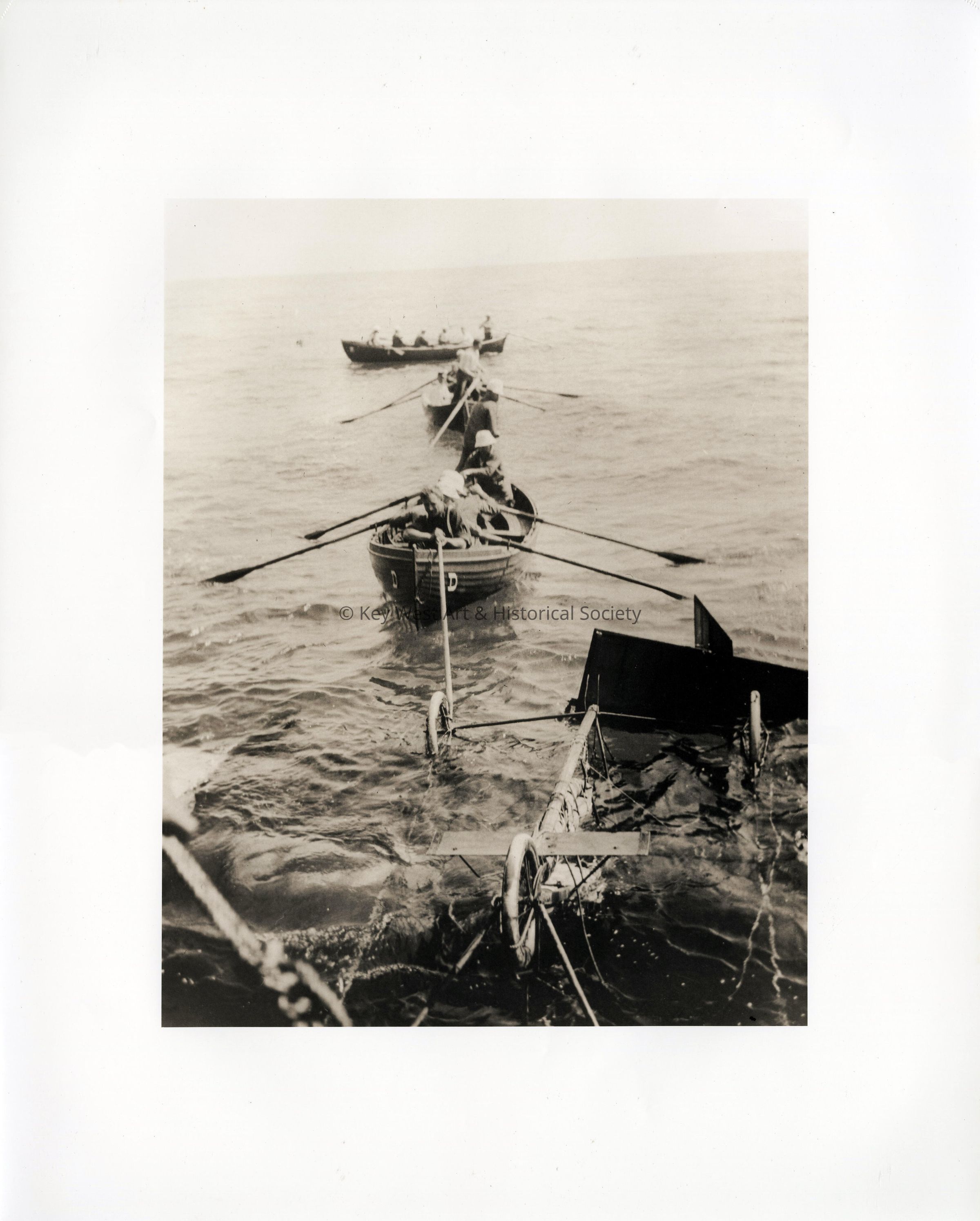 Black and white photograph of the wreckage of John Alexander Douglas McCurdy's plane alongside rescue boats following his failed flight attempt from Key West to Cuba.