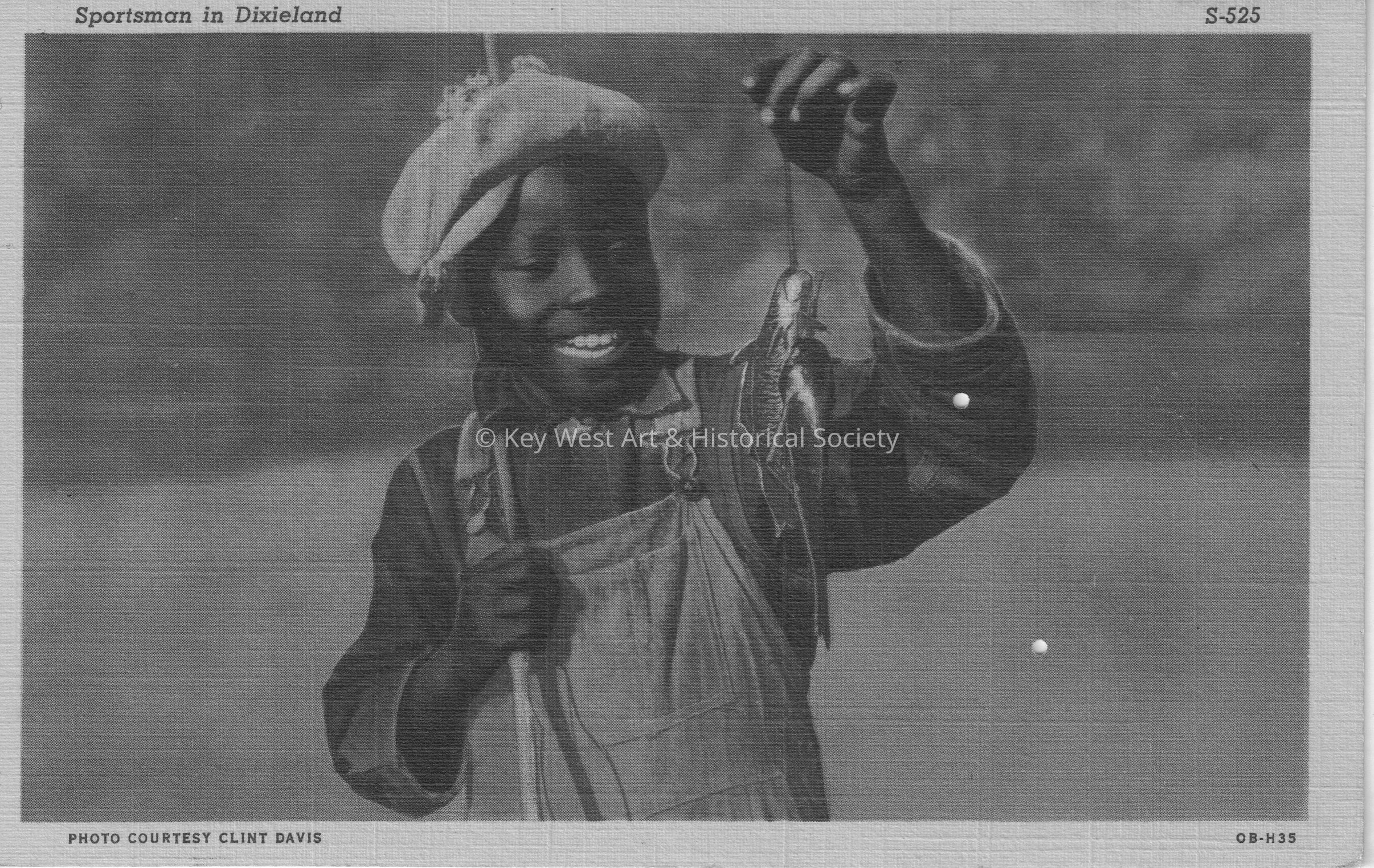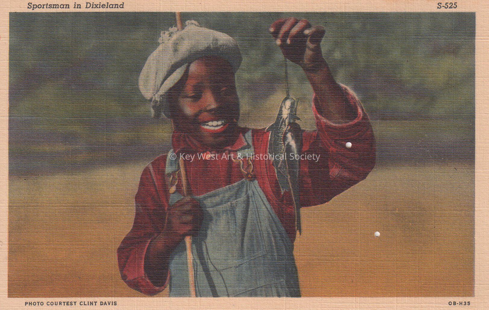 Postcard depicting a boy in overalls and a cap with a fishing pole and a stringer of fresh-caught fish. The caption reads, ‘Sportsman in Dixieland’. The description on the verso reads, ‘See, one scaly fish—one finny, Captured by this pickaninny—Soon to be with ashcake on a dish; Mammy Sue will heat the skillet, And with Cato’s luck she’ll fill it – “Hurry chillum, git you’ bread ‘n fish!”’Collection