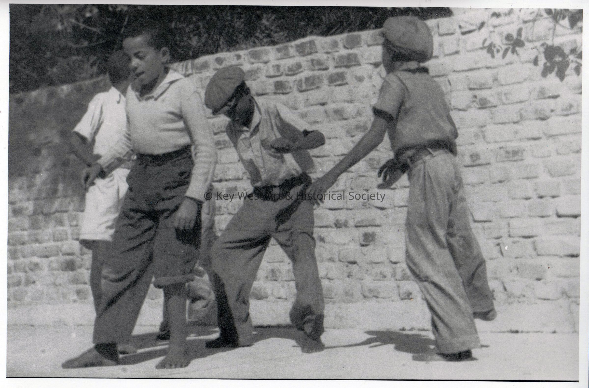Black and white photograph of a group of young boys dancing with bottle tops between their toes in front of the wall surrounding the Hemingway home at 907 Whitehead Street.