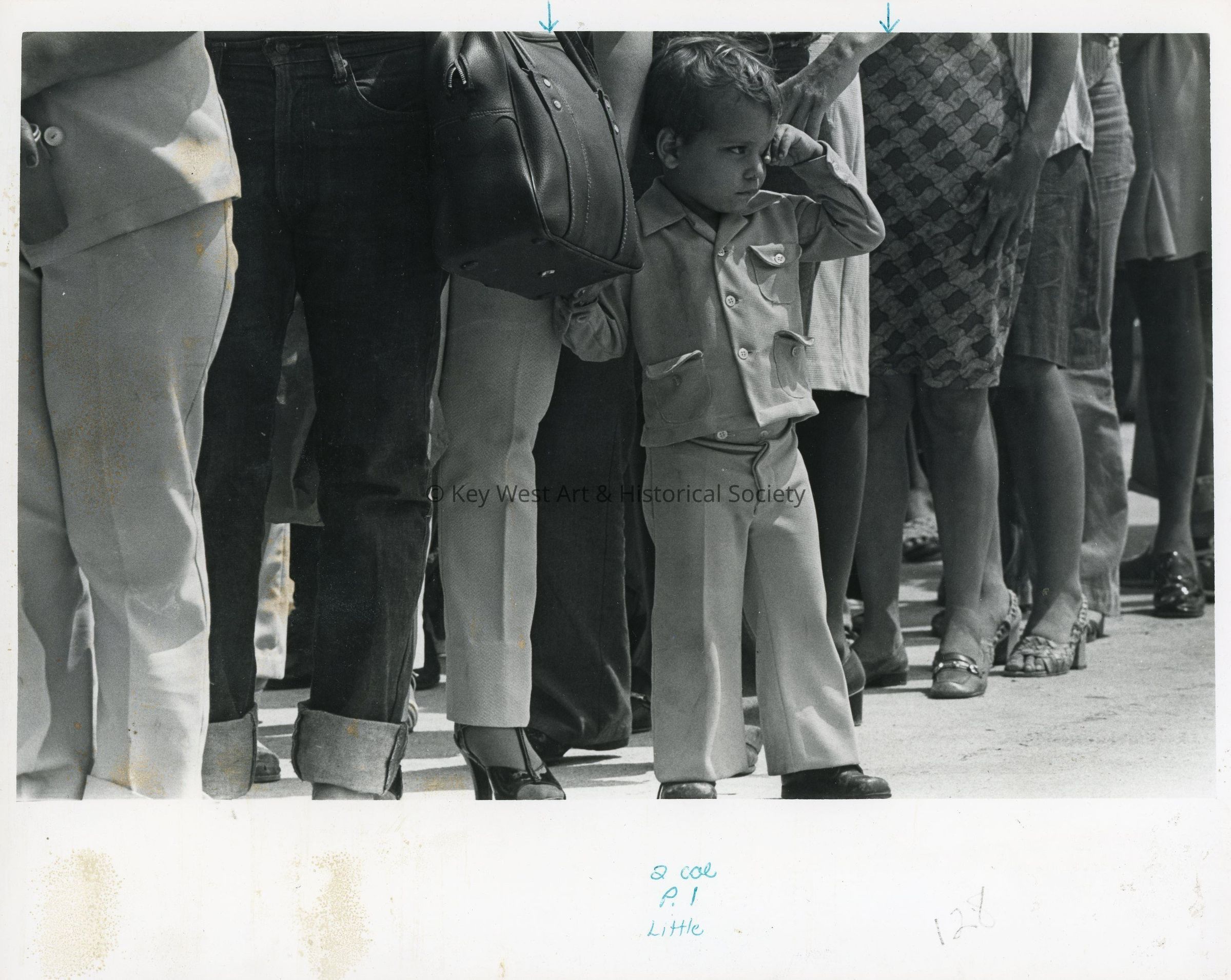 Black and white photograph of a young Cuban refugee on the dock of Naval Station Key West during the Mariel Boatlift.