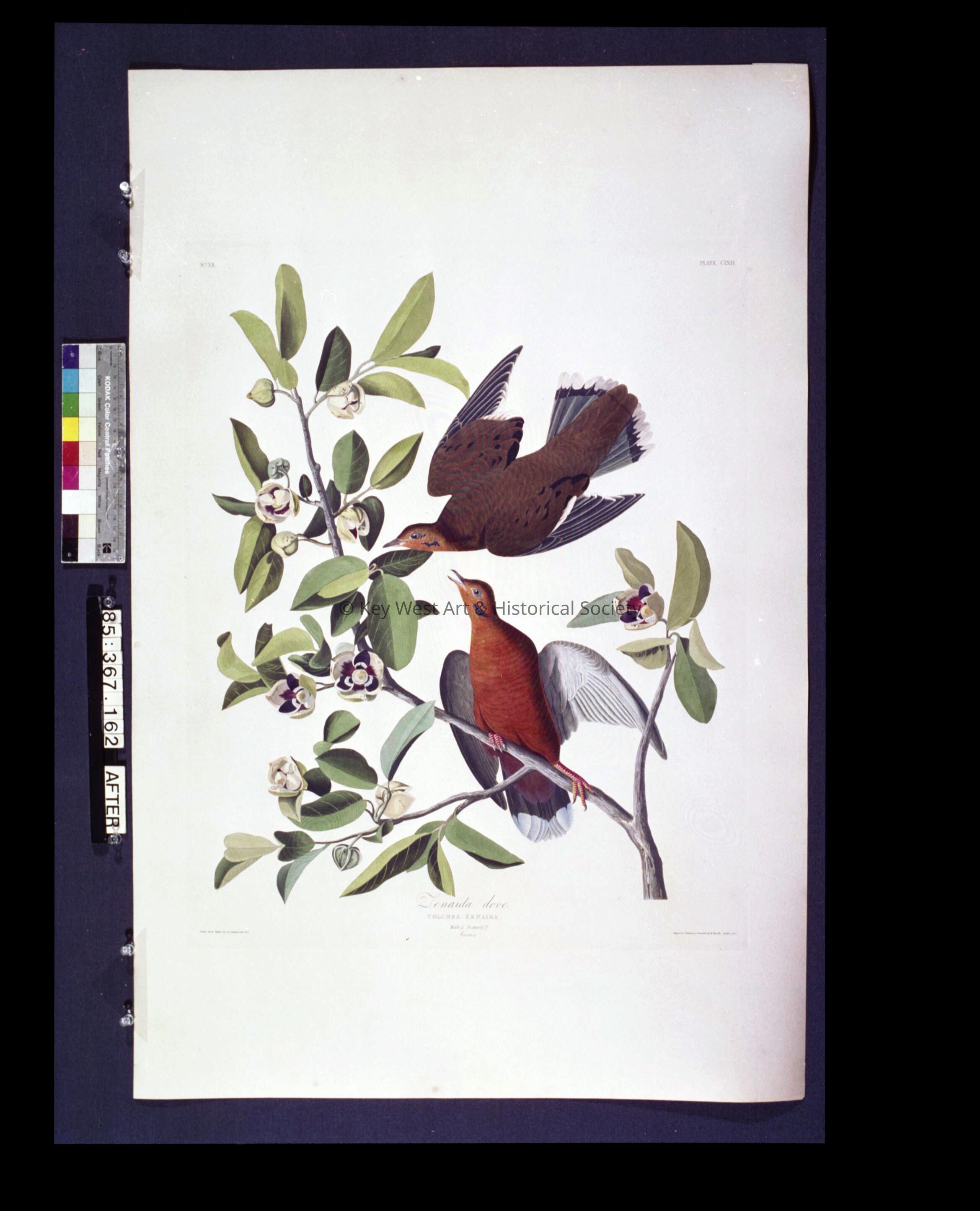 Color negative of John James Audubon's 'Zenaida Dove', plate 162, in 'Birds of America'. He encountered the Zenaida Dove during a visit to the Florida Keys and Cuba in 1832.