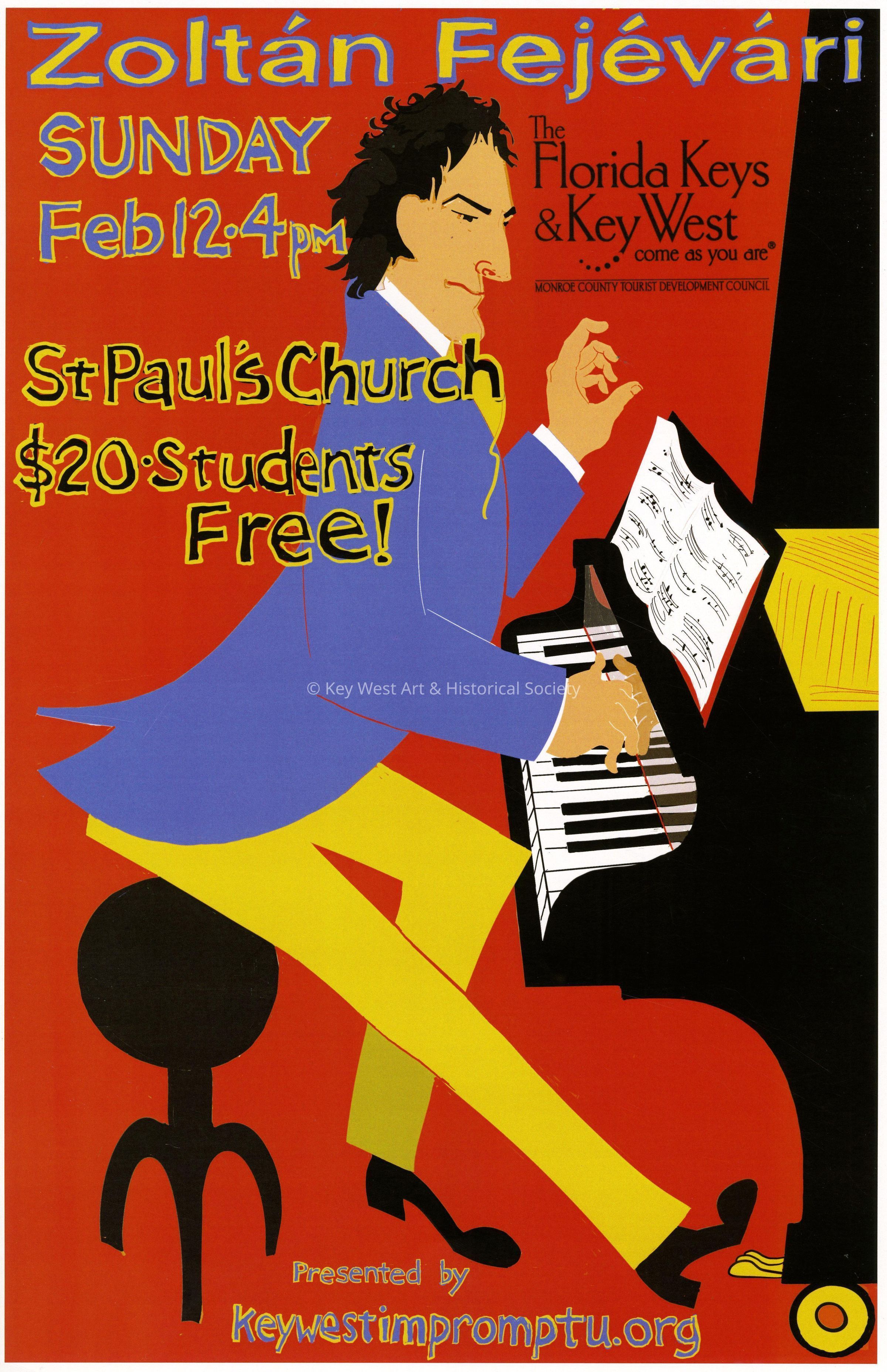 An advertising poster for Impromptu Classical Concerts entitled 'Zoltan Fejevari'. The concert took place on February 12, 2023 at St. Paul's Episcopal Church at 401 Duval Street.Collection