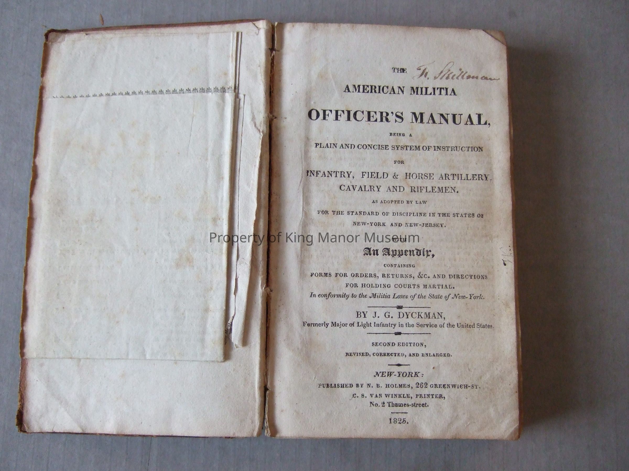 Leather bound, brown book," The American Militia: Officer's Manual". 2nd ed. Published by N.B. Holmes, New York: 1825.Collection