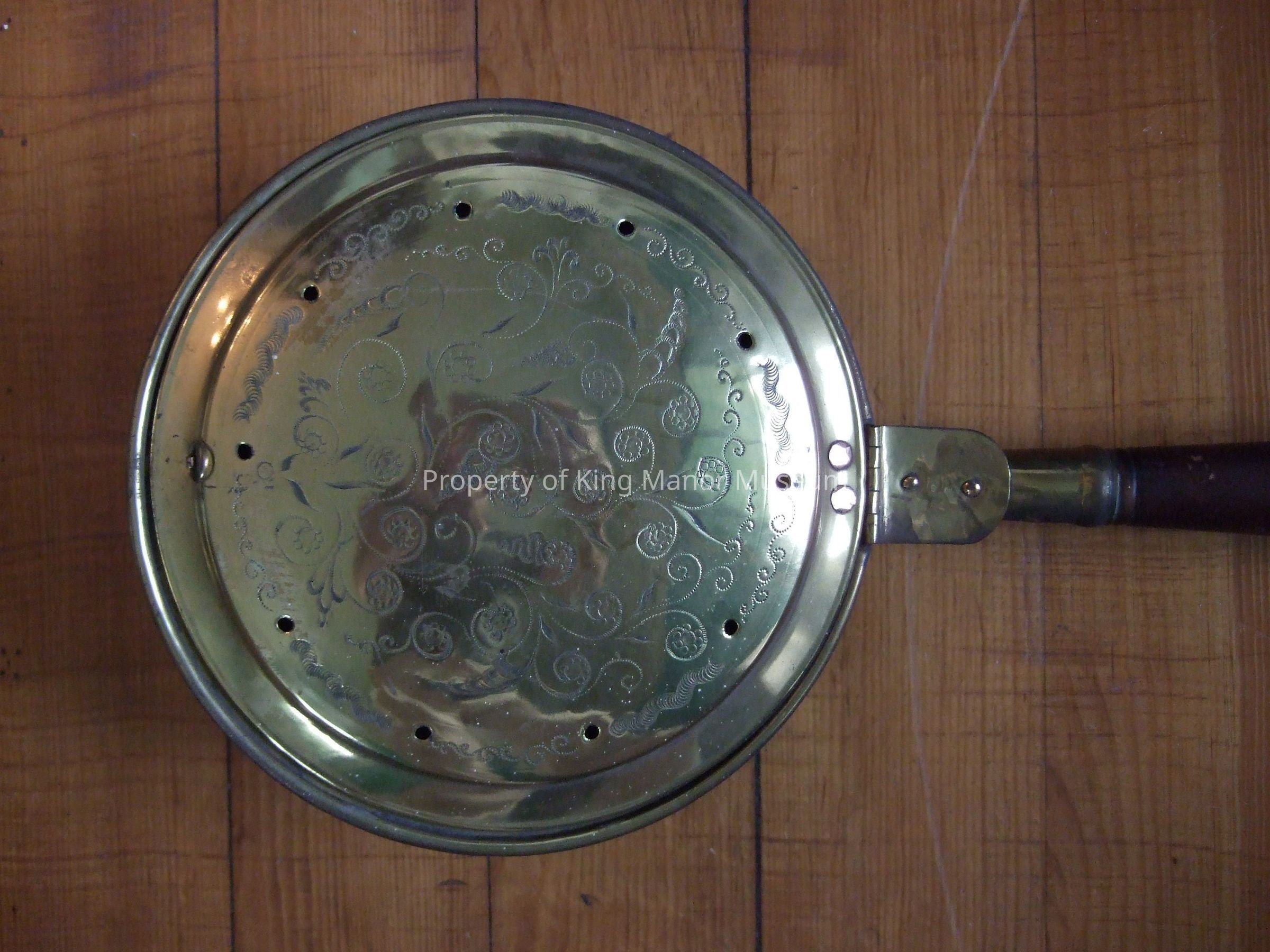 Brass pan and turned wood handle warming pan, attached to each other with copper nailheads. Pan is decorated with incised designs