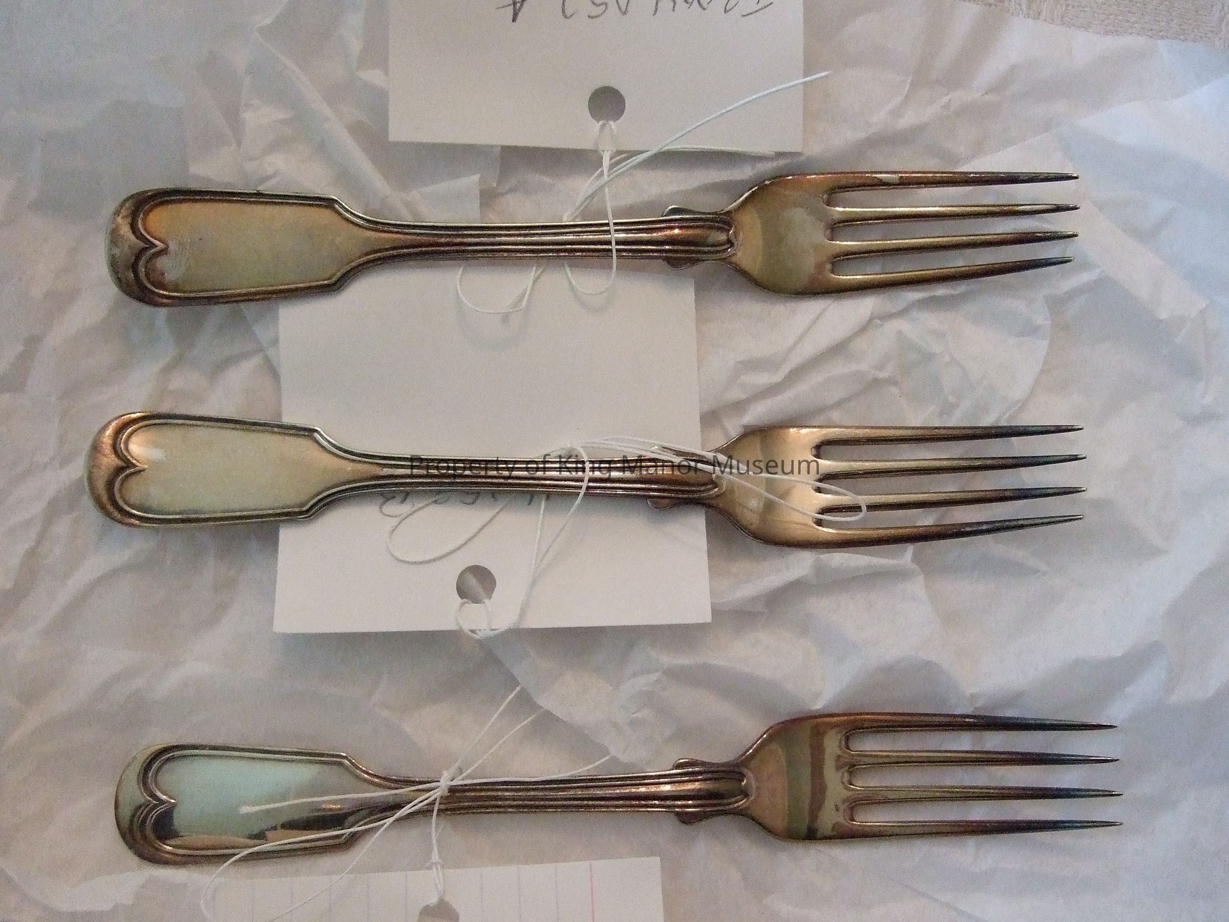 Set of three fiddle thread silver forks, with unidentified hallmarks.Collection