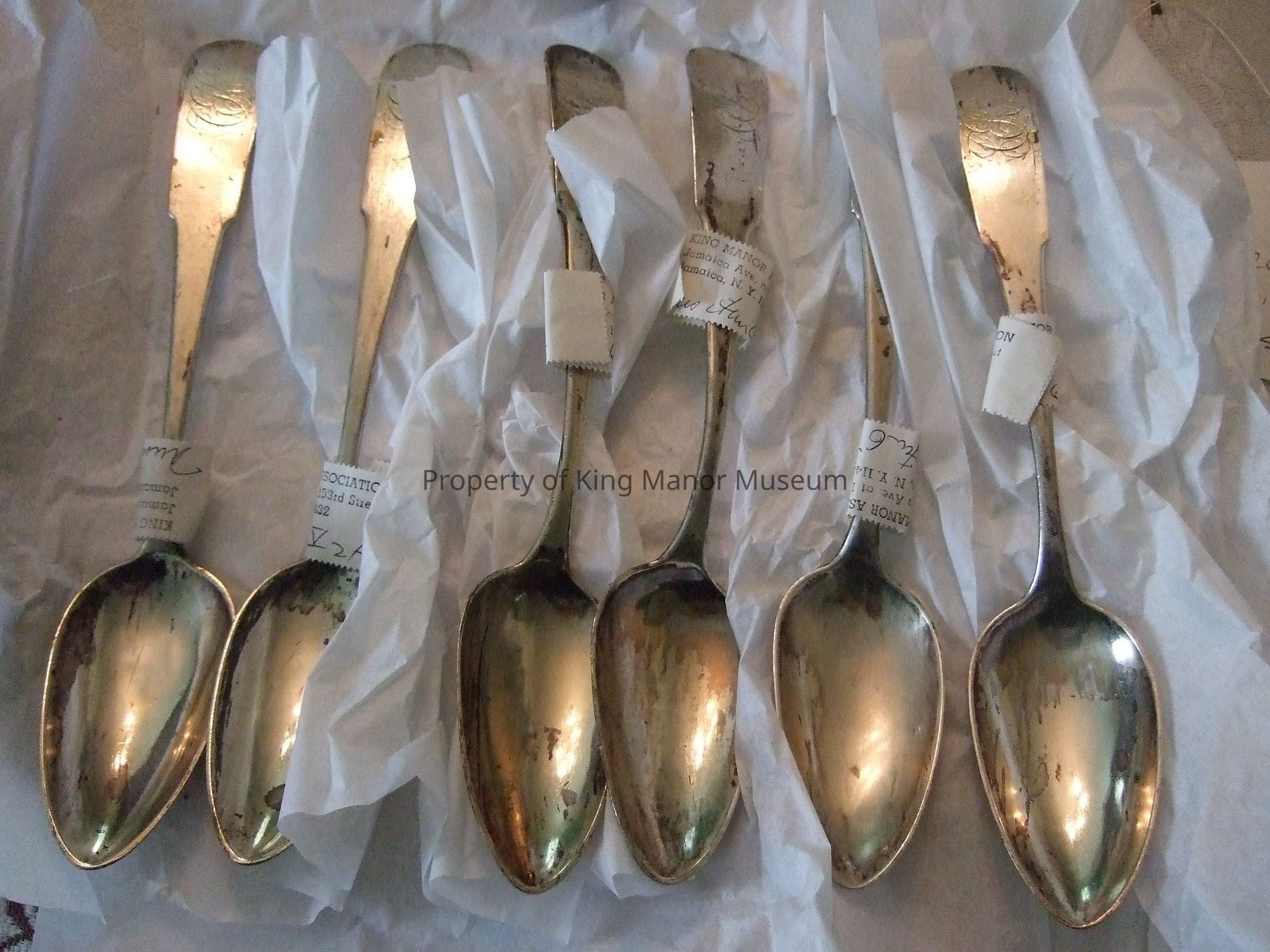 A set of six silver spoons with pointed bowls and rounded handles; monogram engraved in feathered script "CEK" on handle. "T&H" stamped on back of handle in rectangle. KMA sticker wrapped around spoon.