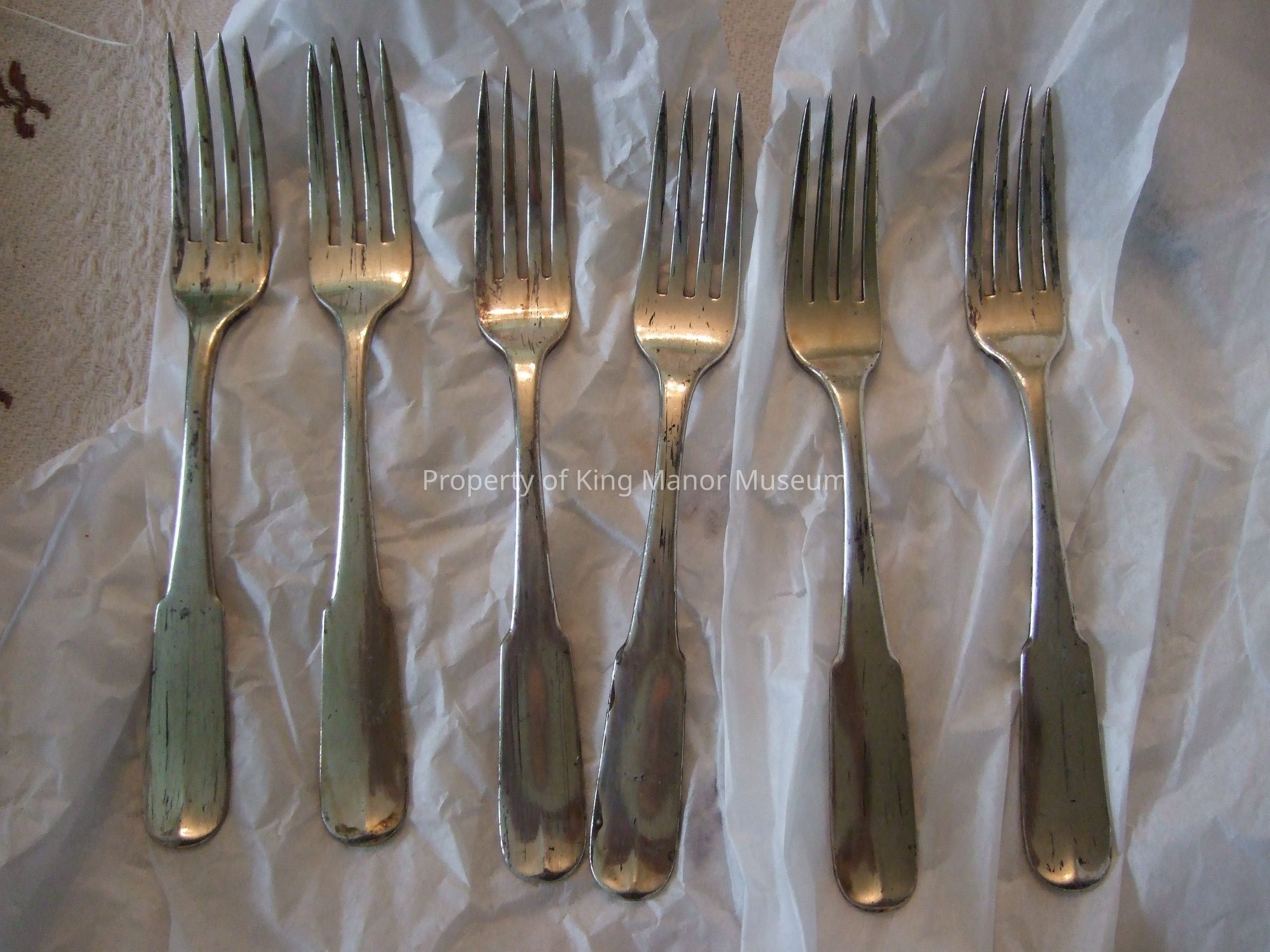 Set of 6 silver four-tined fiddle back handled forks, engraved on back of handles with monogram "CEK" in feathery script. Stamped on back "T&H" in rectangle. Same pattern as T2004.055 spoons.