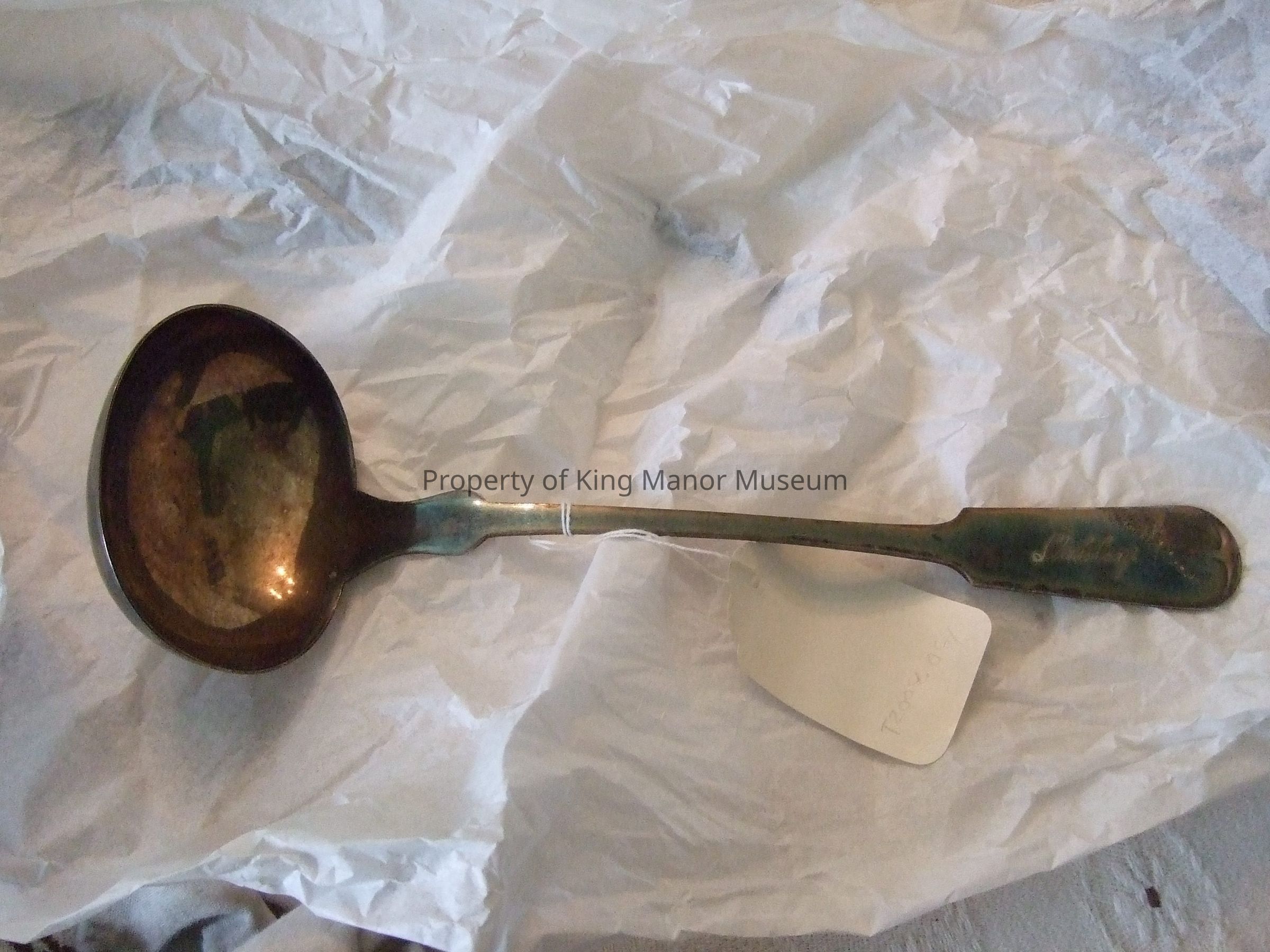Silver fiddleback ladle with flared shoulders and point on bowl back, engraved on handle in script "Oakley" and stamped on back "F Curtin & Co." in rectangle.