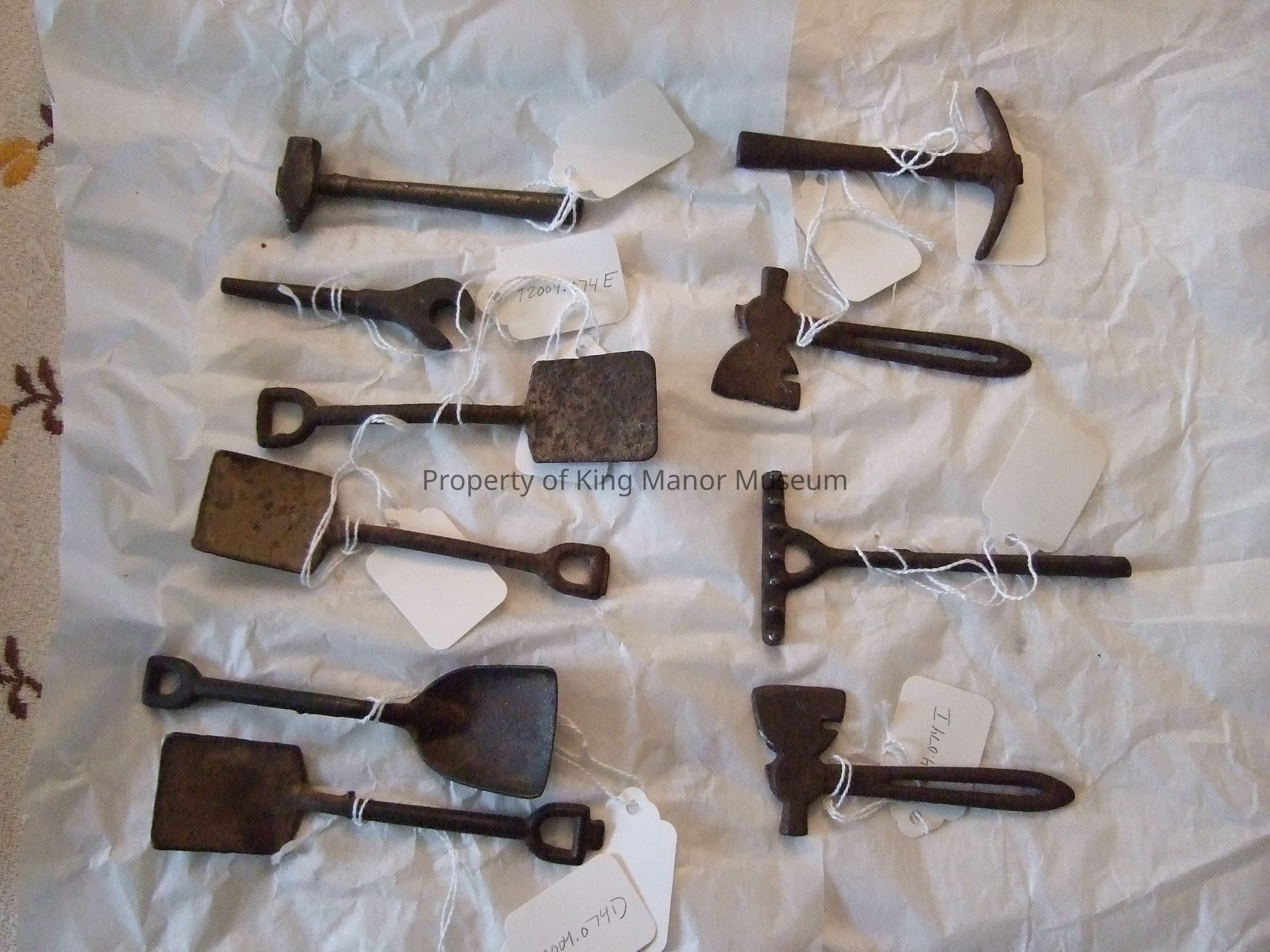 A - shovel with rat-tail on back bowl, u-shaped cut-out handle. 4.75 in.